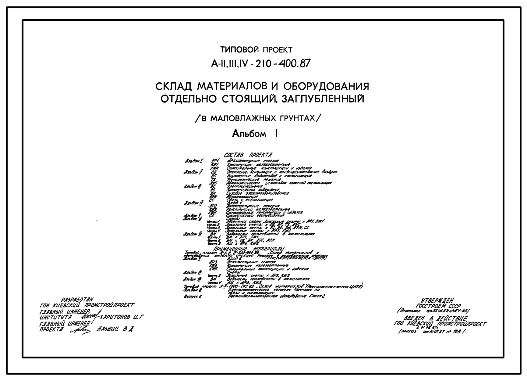 Типовой проект А-II,III,IV-210-400.87 Заглубленный склад материалов и оборудования отдельно стоящий (в маловлажных грунтах) (убежище на 210 человек, размеры убежища 12м на 12м, режимы вентиляции убежища 1,2)