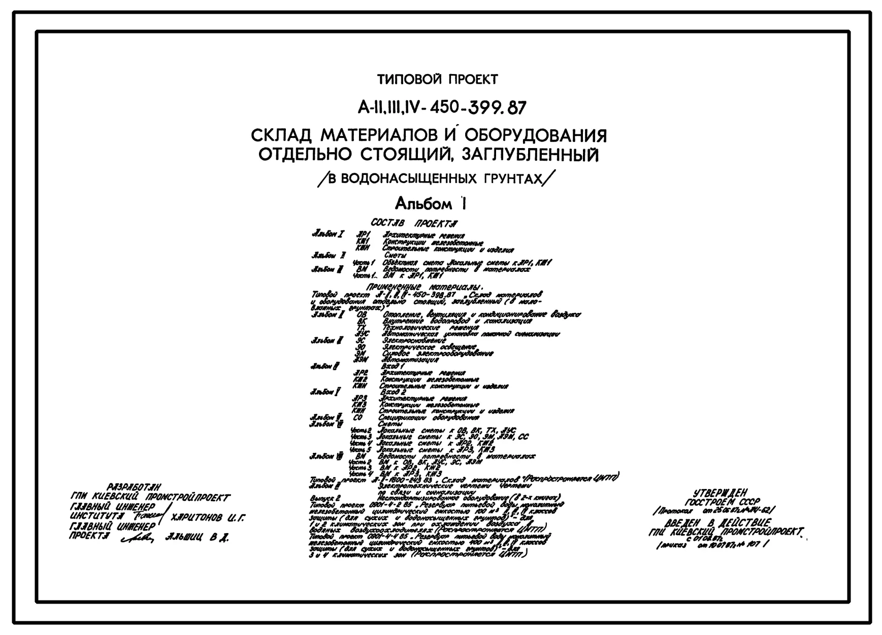 Типовой проект А-II,III,IV-450-399.87 Заглубленный склад материалов и оборудования отдельно стоящий (в водонасыщенных грунтах) (убежище на 450 человек, размеры убежища 30м на 12м, режимы вентиляции убежища 1,2,3)