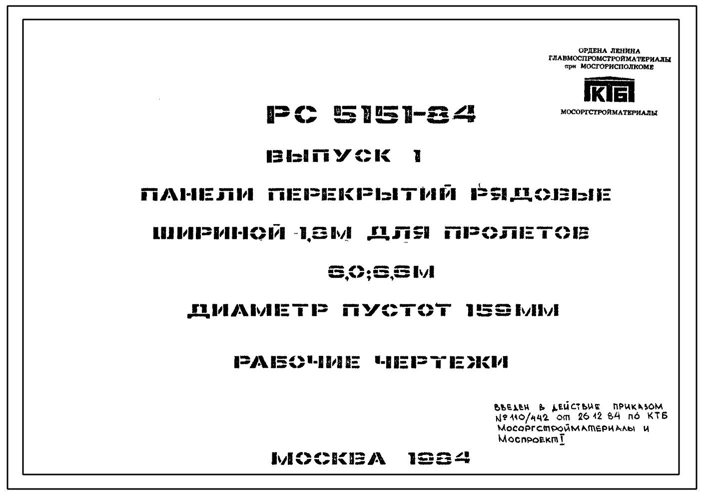 Шифр РС-5151-84 Панели перекрытий рядовые шириной 1,8 м для пролетов 5,4, 6,0; 6,6 м, диаметр пустот 159 и 140 мм (1984 г.)