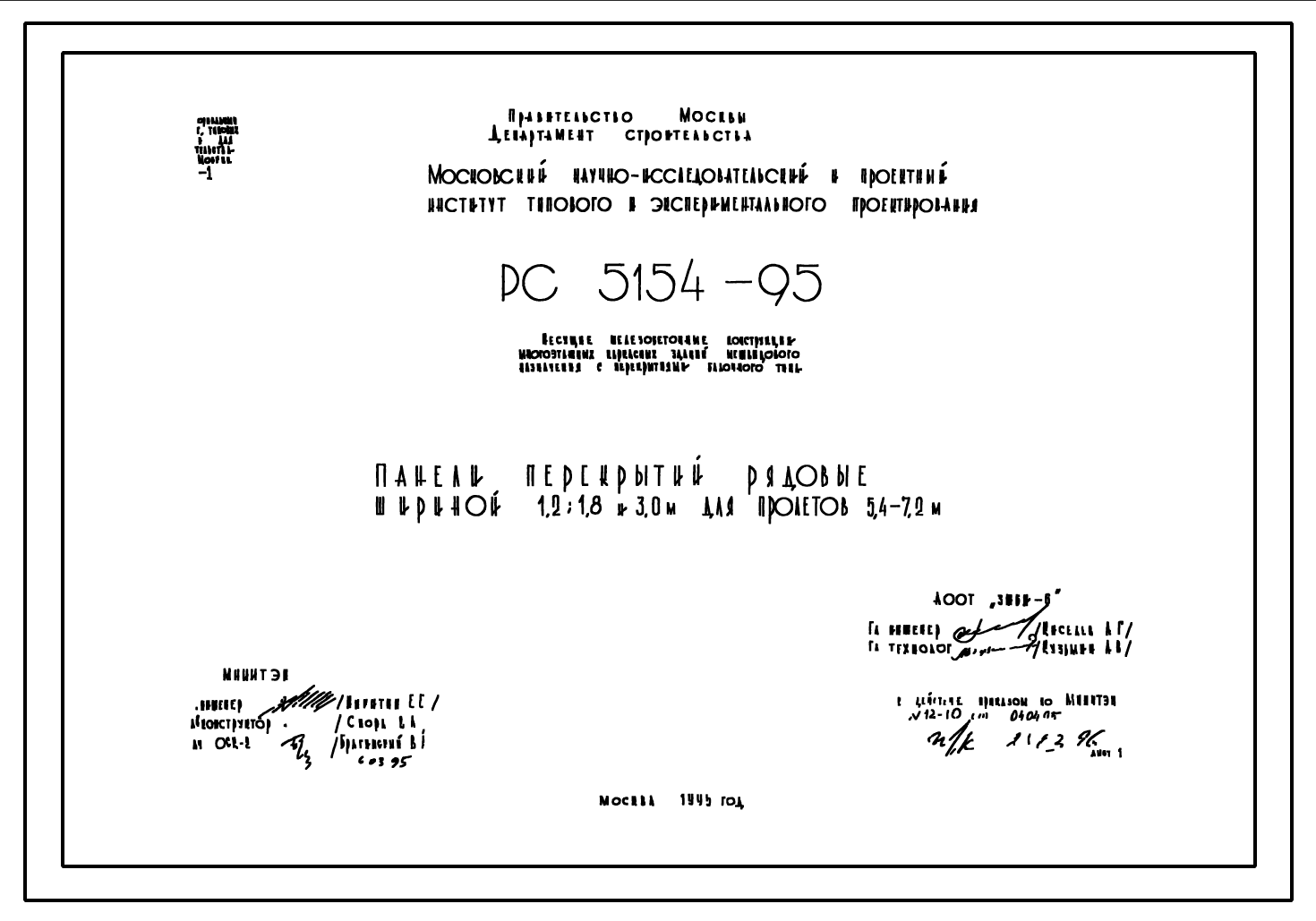 Шифр РС5154-95 Несущие железобетонные конструкции многоэтажных каркасных зданий межвидового назначения с перекрытиями балочного типа. Панели перекрытий рядовые шириной 1,2; 1,8 и 3,0 м для пролетов 5,4?7,2 м (1995 г.)