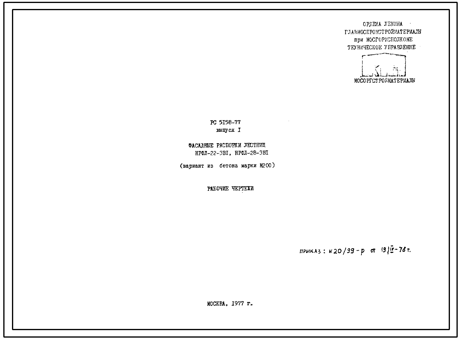Шифр РС5158-77 Фасадные распорки лестниц НРФЛ-22-3В1; НРФЛ-28-3В1 (вариант из бетона марки М200) (1977 г.)