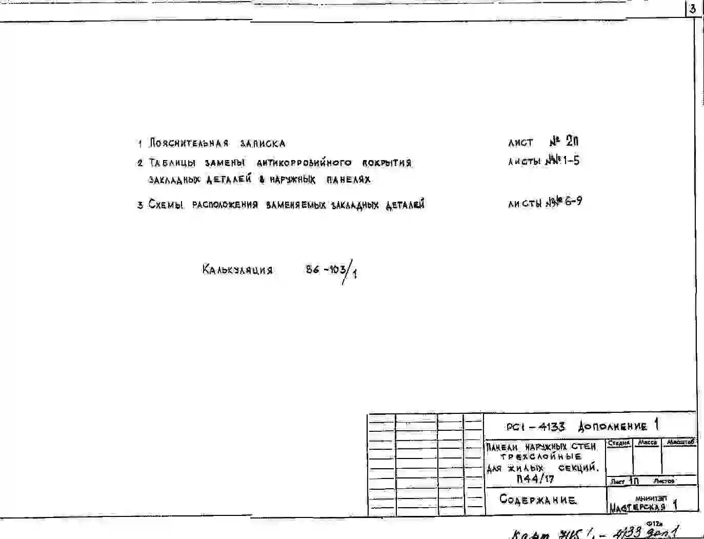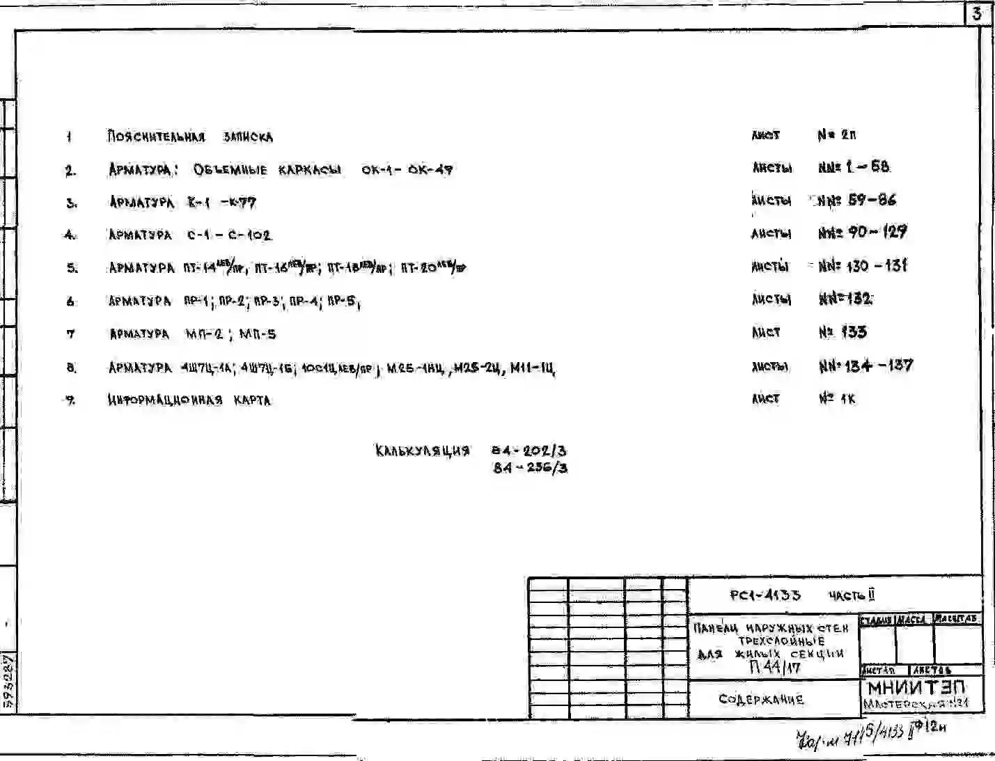 Шифр РС1 4133 Панели наружных стен трехслойные для жилых секций П44/17 с повышенными теплозащитными качествами (1984 г.)