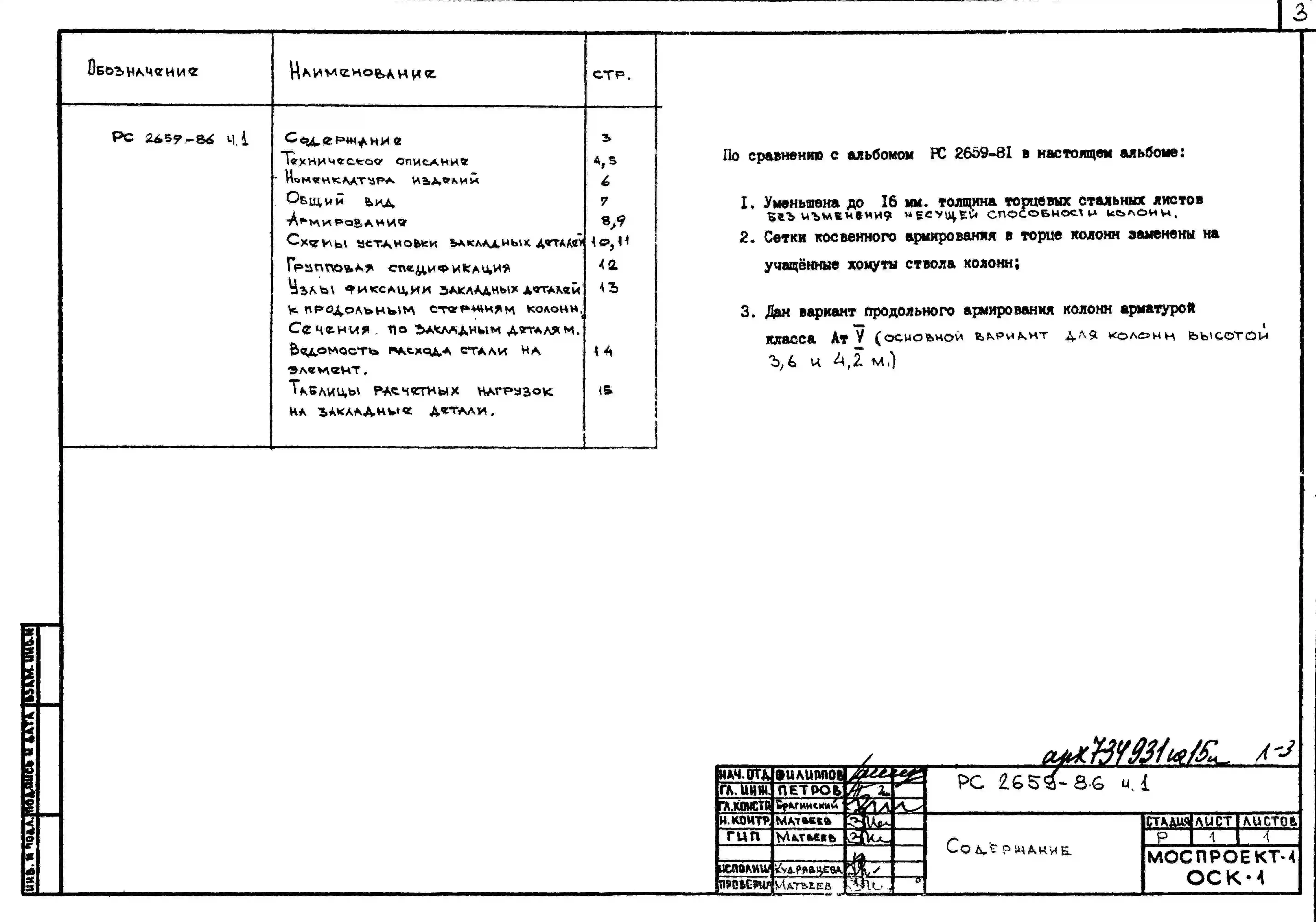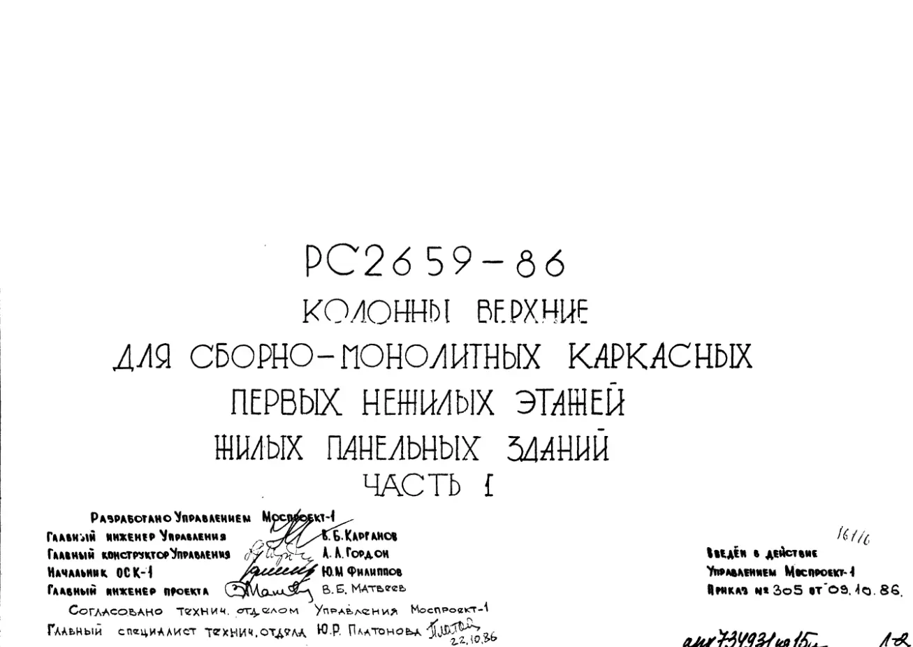 Шифр РС 2659-86 Колонны верхние для сборно-монолитных каркасных первых нежилых этажей жилых панельных зданий (1986 г.)