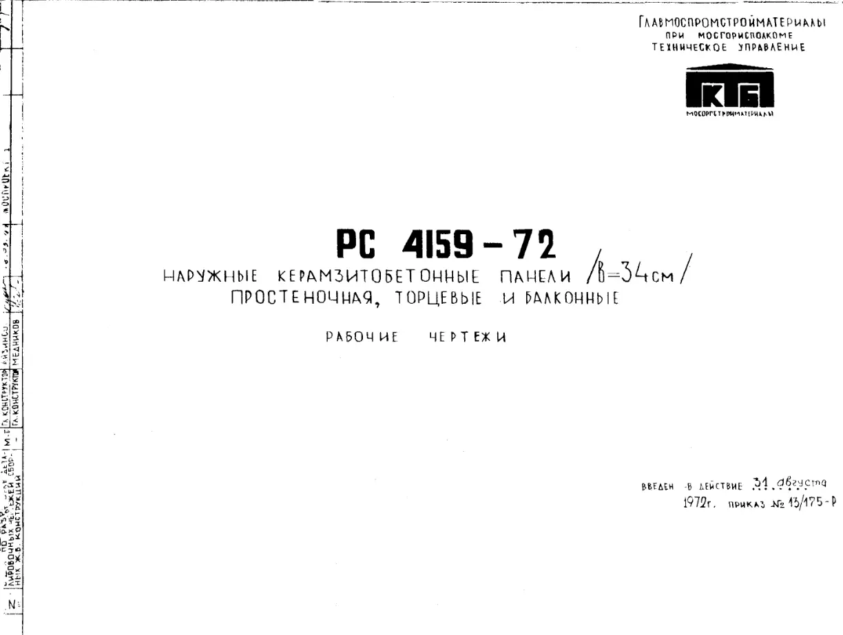 Шифр РС 4159-72 Наружные керамзитобетонные панели (в=34 см) простеночная, торцевые и балконные (1972 г.)