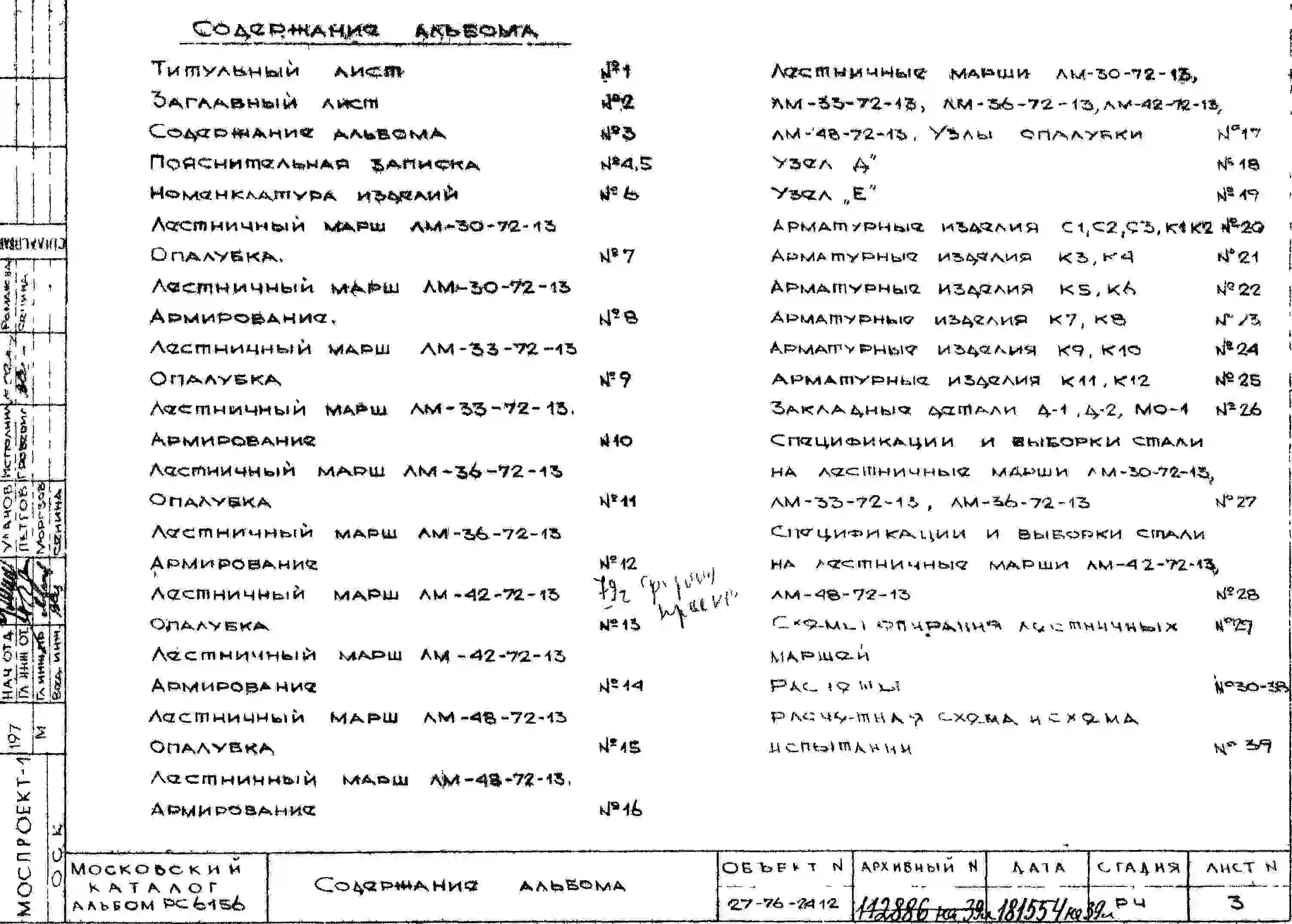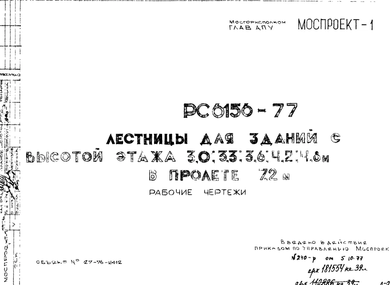 Шифр РС 6156-77 Лестницы для зданий с высотой этажа 3,0; 3,3; 3,6; 4,2; 4,8 м в пролете 7,2м (1977 г.)