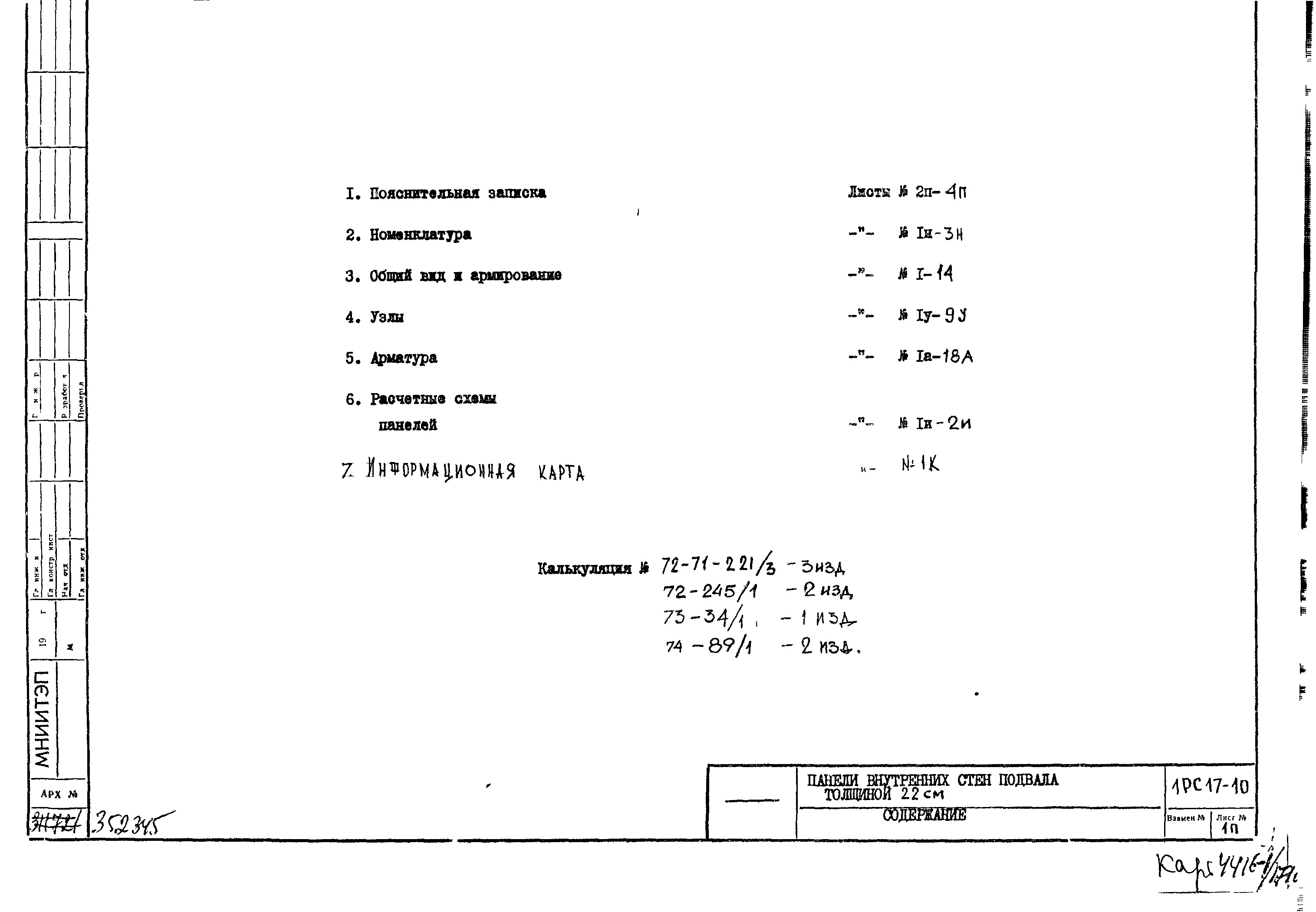 Шифр 1РС 17-10 Панели внутренних стен подвала толщиной 22 см. Рабочие чертежи. Разработка 1972 года