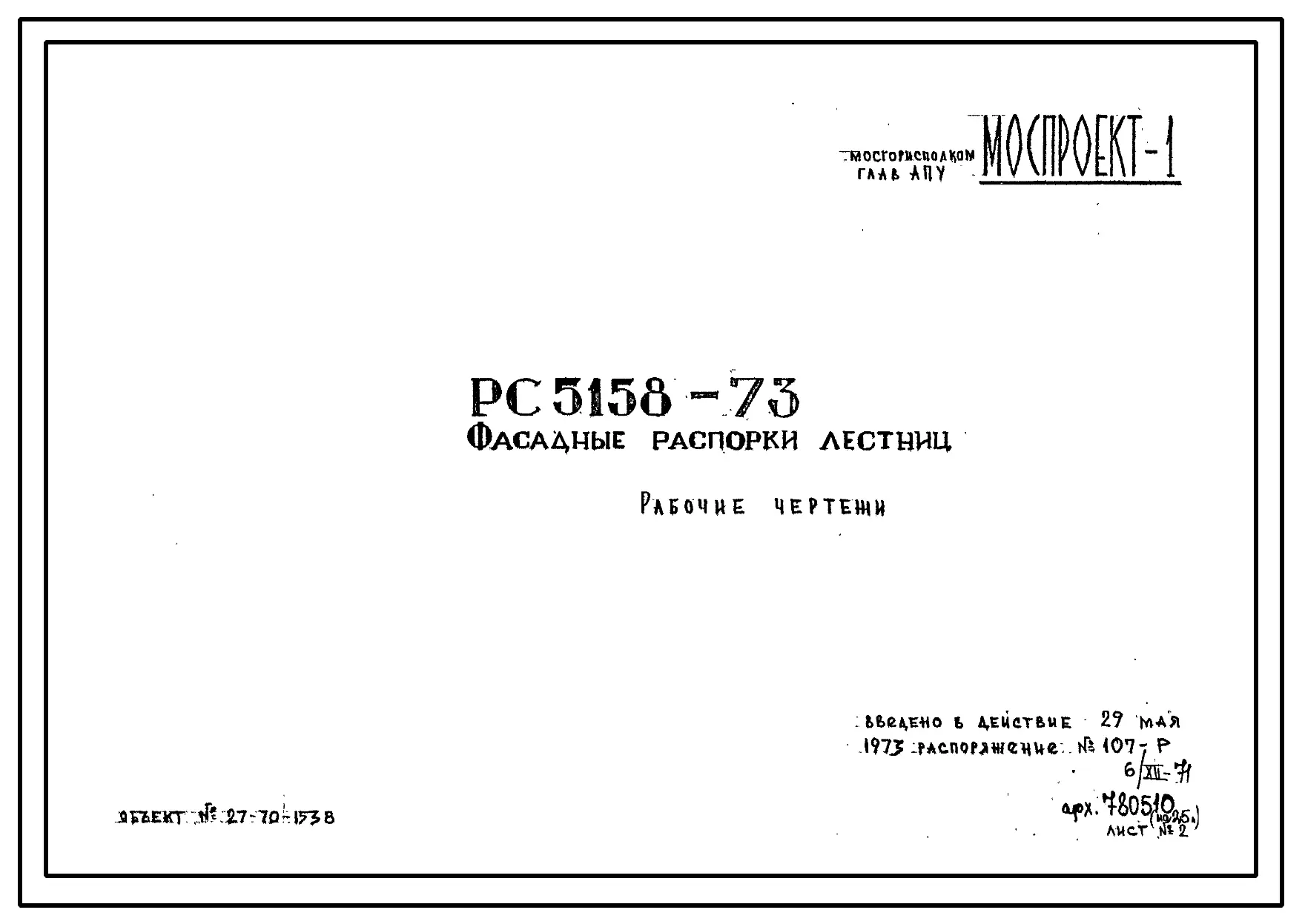 Шифр РС 5158-73 Фасадные распорки лестниц. Рабочие чертежи. Разработка 1971 года