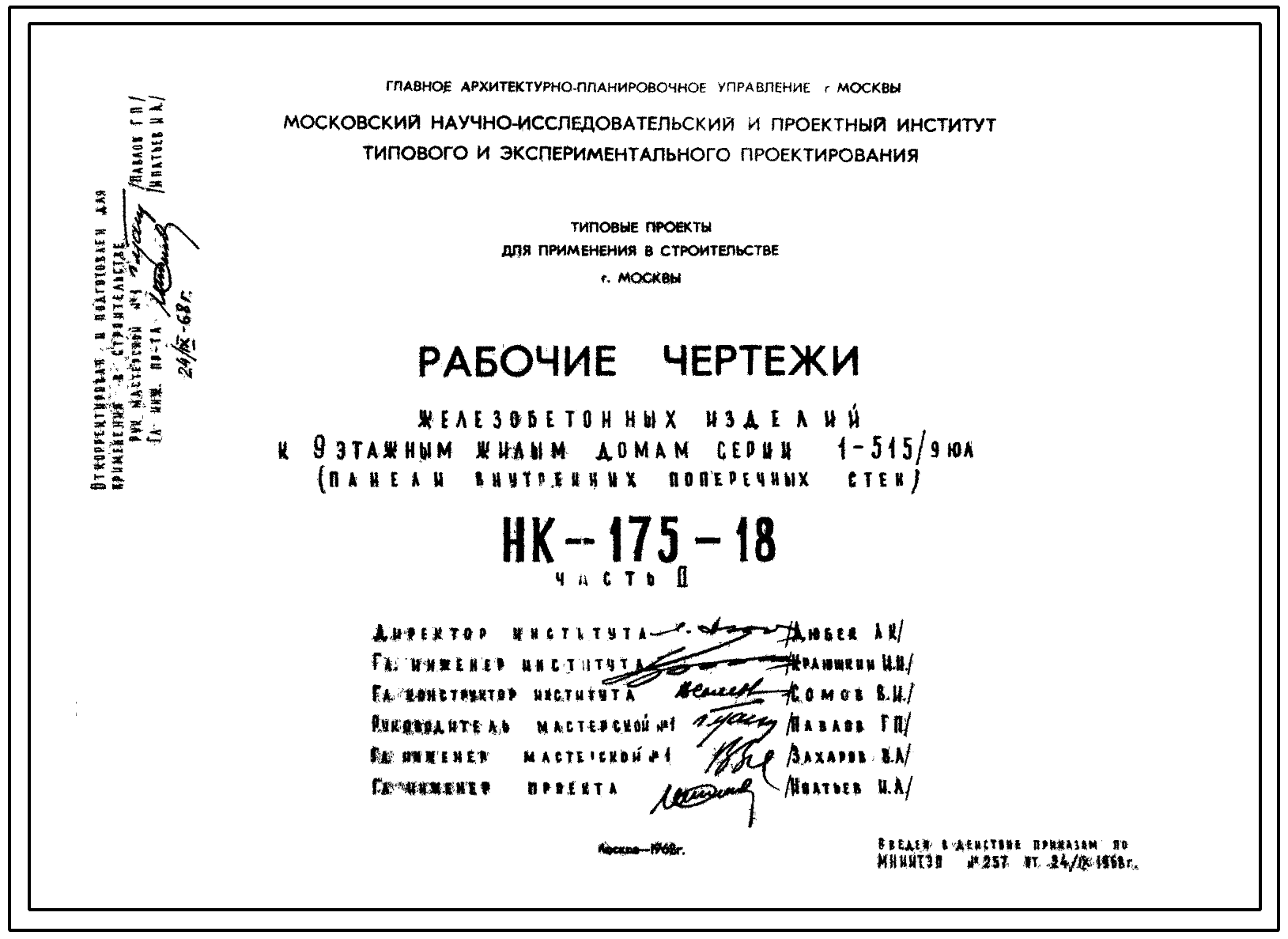 Шифр НК-175-18 Железобетонные изделия к 9-этажным жилым домам серии 1-515/9юл (панели внутренних поперечных стен) (1968 г.)