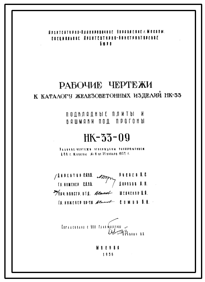 Шифр НК-33-09 Каталог железобетонныхизделий НК-33. Подкладные плиты и башмаки под прогоны (1956 г.)