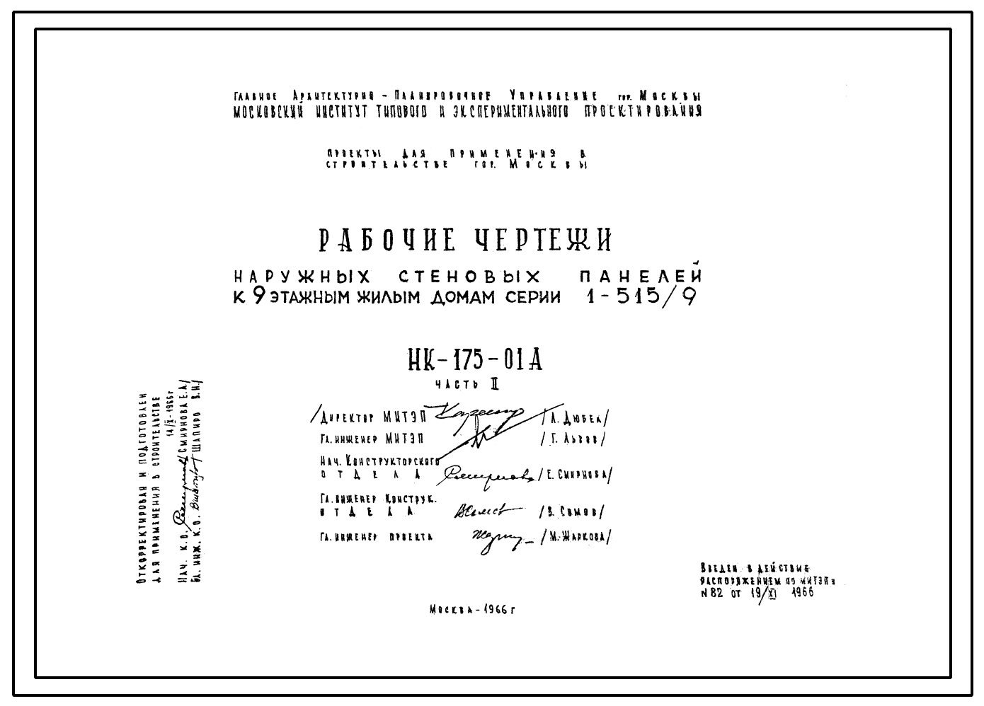 Шифр НК-175-01А Наружные стеновые панели к 9 этажным жилым домам серии 1-515/9 (1966 г.)