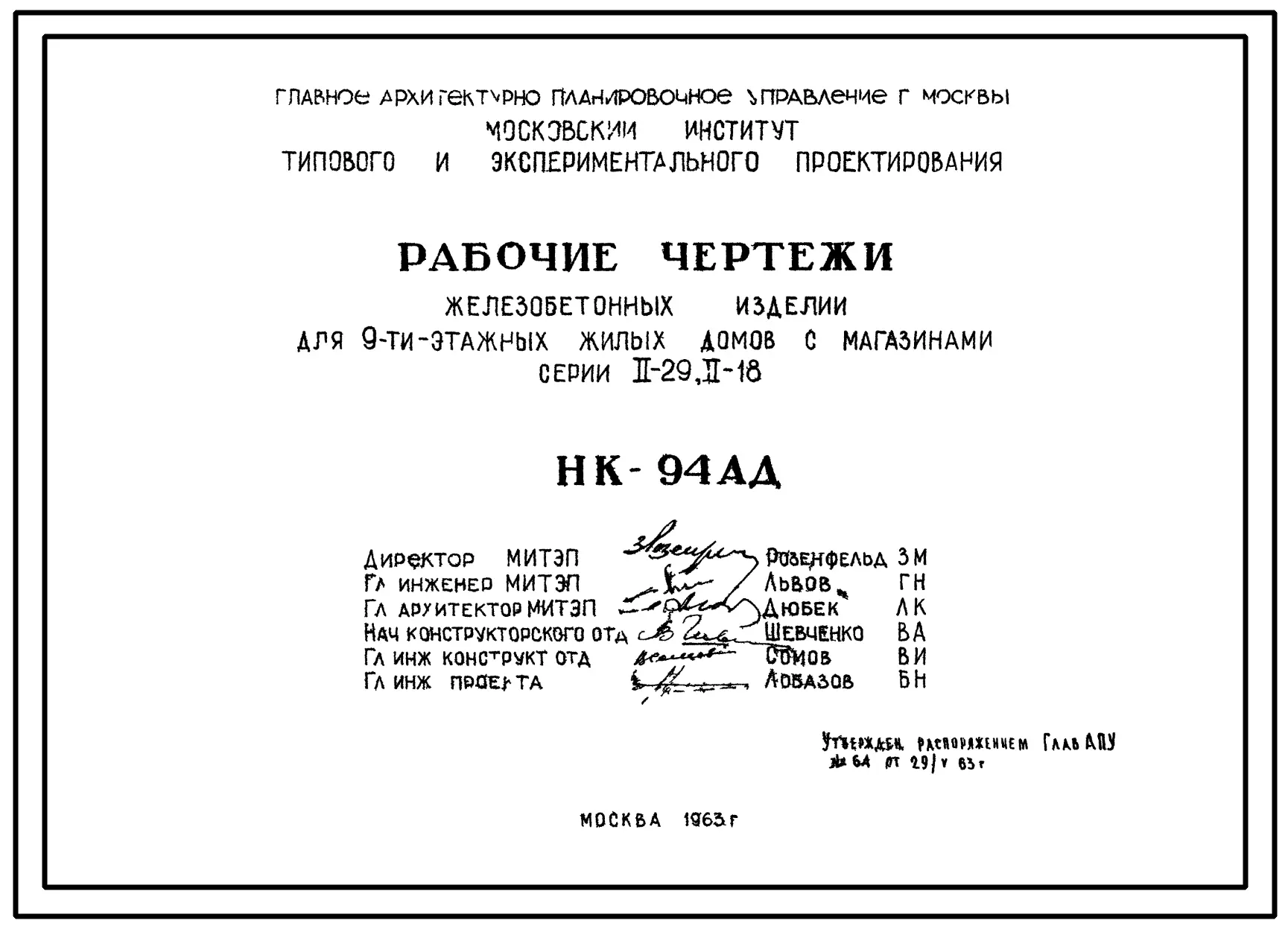 Шифр НК-94АД Железобетонные изделия для 9-этажных жилых домов с магазинами, серии II-29, II-18 (1963 г.)