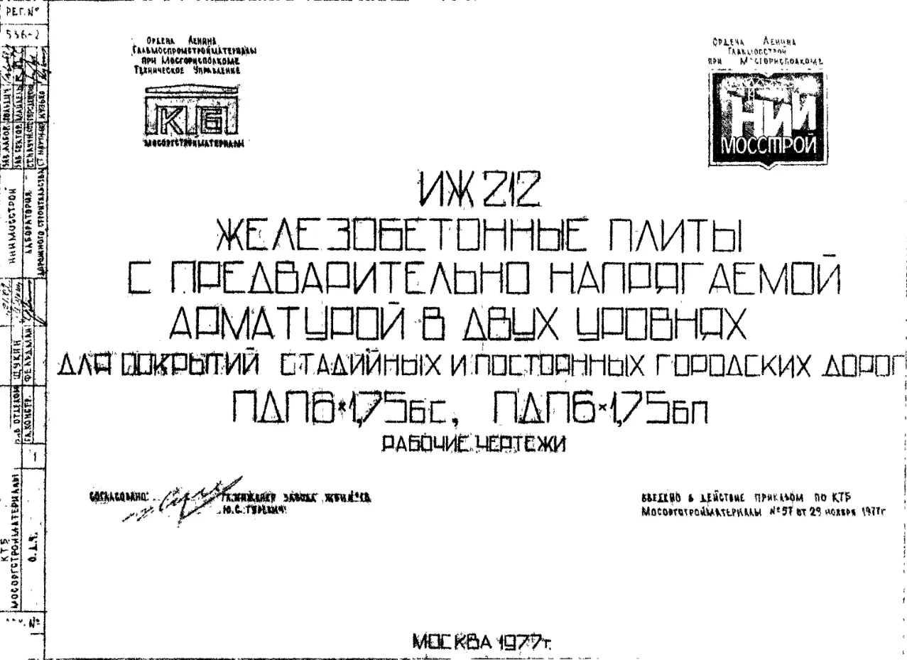 Шифр ИЖ 212 Железобетонные плиты с предварительно напрягаемой арматурой в двух уровнях для покрытий стадийных и постоянных городских дорог ПДП6х1,75 бс; ПДП6х1,75 бп (1977 г.)