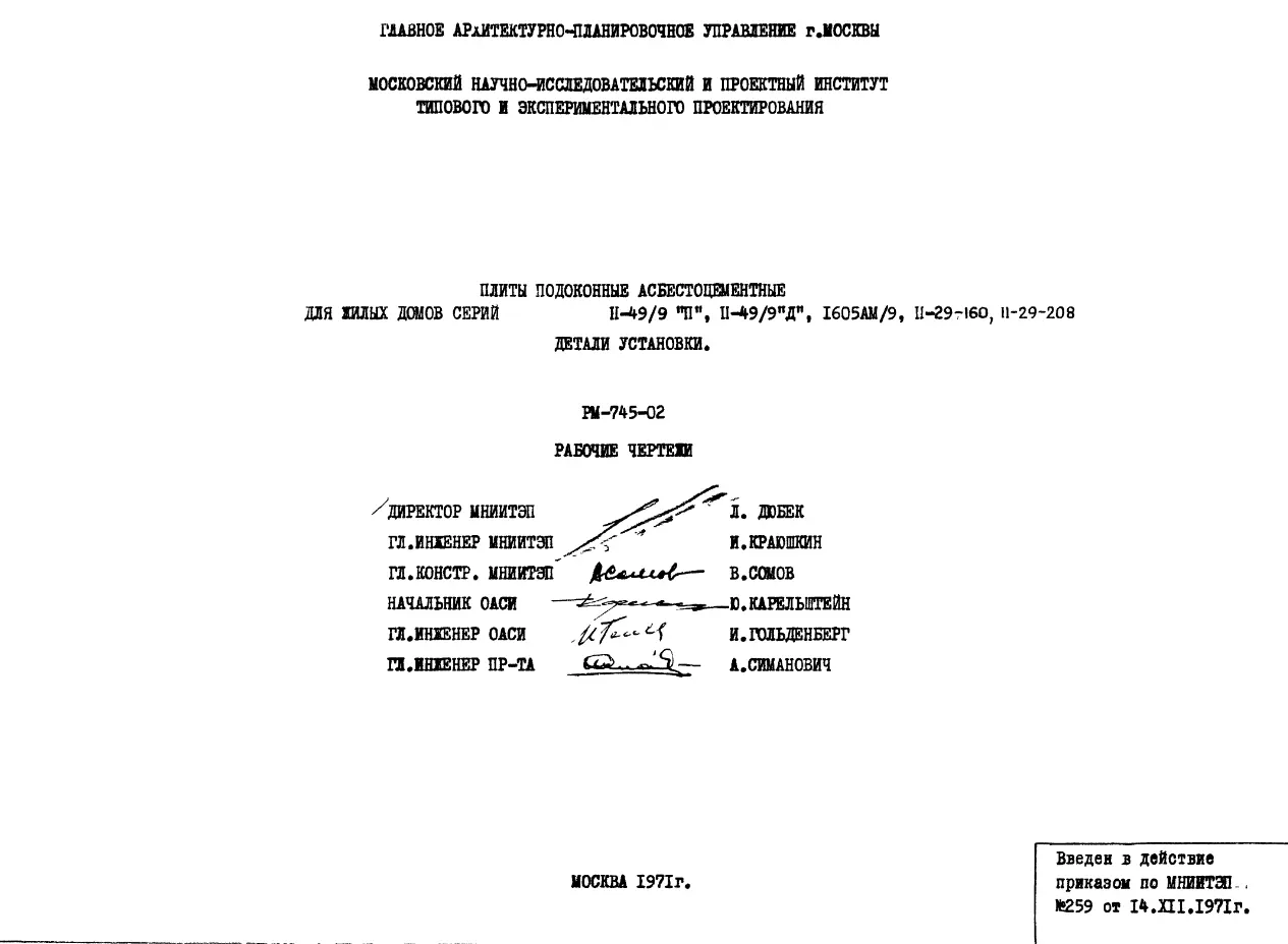 Шифр РМ-745-02 Плиты подоконные асбестоцементныедля жилых домов серий II-49/9"П", II-49/9"Д", 1605АМ/9, II-29-160, II-29-208 детали установки (1971 г.)