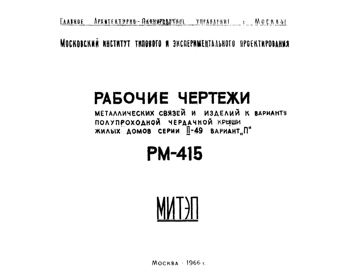 Шифр РМ-415 Металлические связи и изделия к варианту полупроходной чердачной крыши жилых домов серии II-49 вариант "П" (1966 г.)