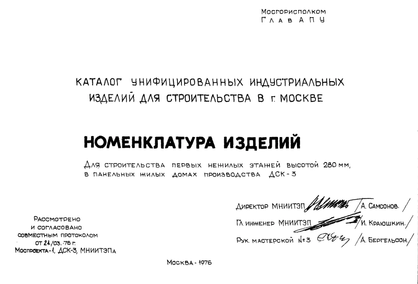 Шифр РМ-1135 Номенклатура изделий для строительства первых нежилых этажей высотой 280 мм, в панельных жилых домах производства ДСК-3 (1976 г.)