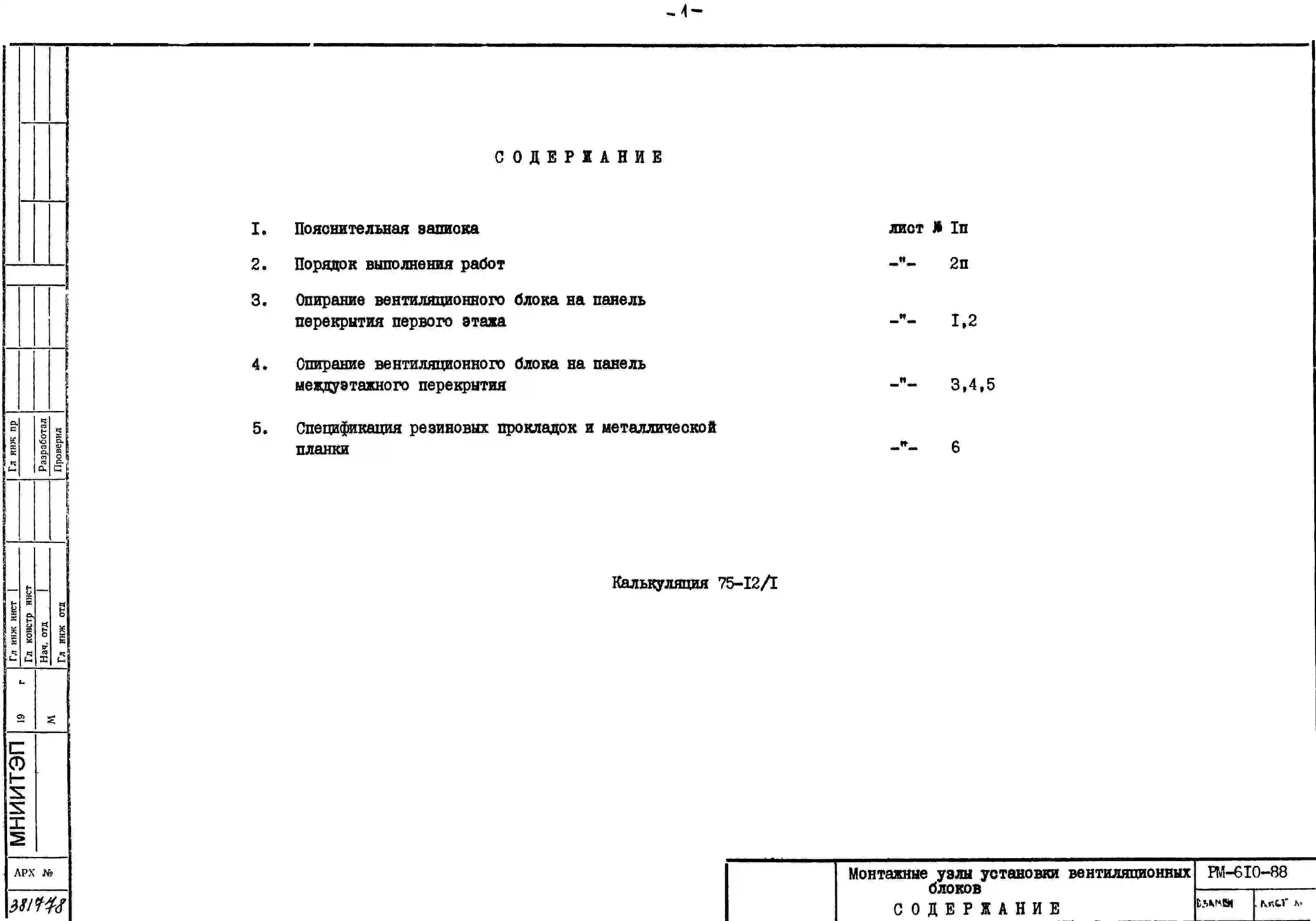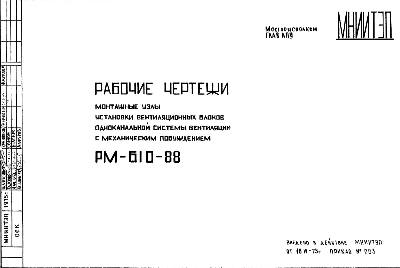 Шифр РМ-610-88 Монтажные узлы установки вентиляционных блоков одноканальной системы вентиляции с механическим побуждением (1975 г.)