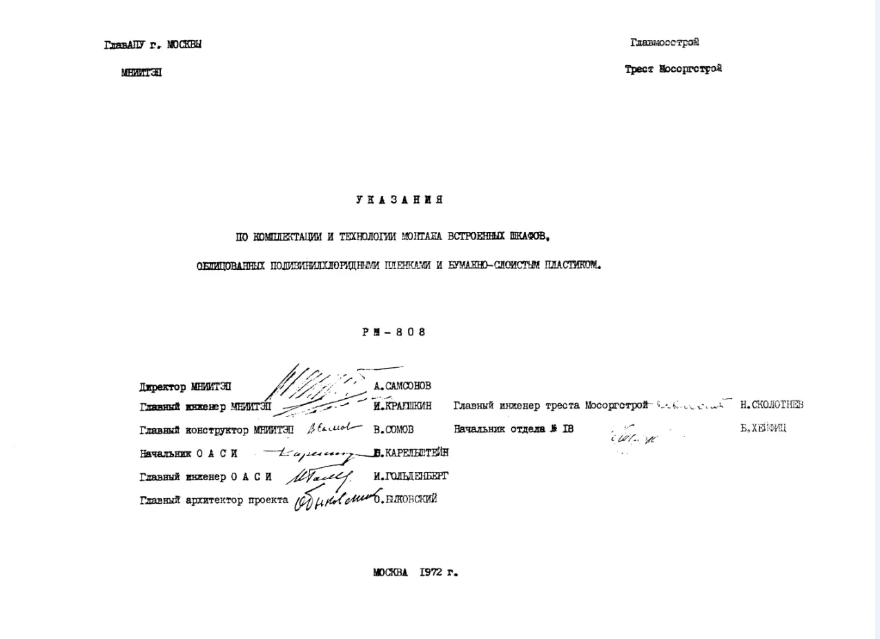 Шифр РМ-808 Указания по комплектации и технологии монтажа встроенных шкафов, облицованных поливинхлоридными пленками и бумажно-слоистым пластиком (1972 г.)