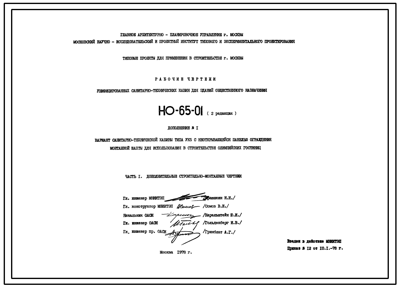 Шифр НО-65-01 Вариант санитарно-технической кабины типа УК5 с неоткрывающейся панелью ограждения монтажной шахты для использования в строительстве Олимпийских гостиниц (1978 г.)