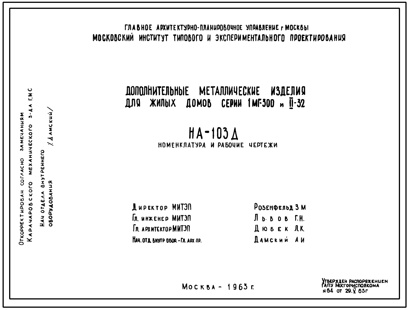 Шифр НА-103Д Дополнительные металлические изделия для жилых домов серии 1МГ-300 и II-32 (1963 г.)