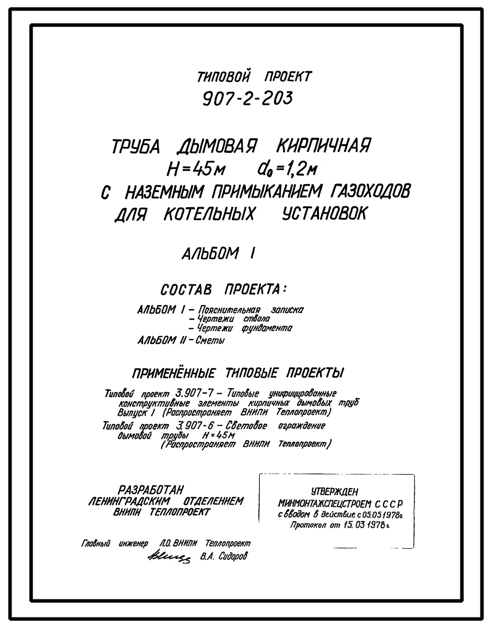 типовой проект 907-2-203 труба дымовая кирпичная н=45 м, д0=1,2 м с наземным примыканием газоходов для котельных установок. для строительства в 1-4 климатических районов кроме подрайонов 1а и 1б.