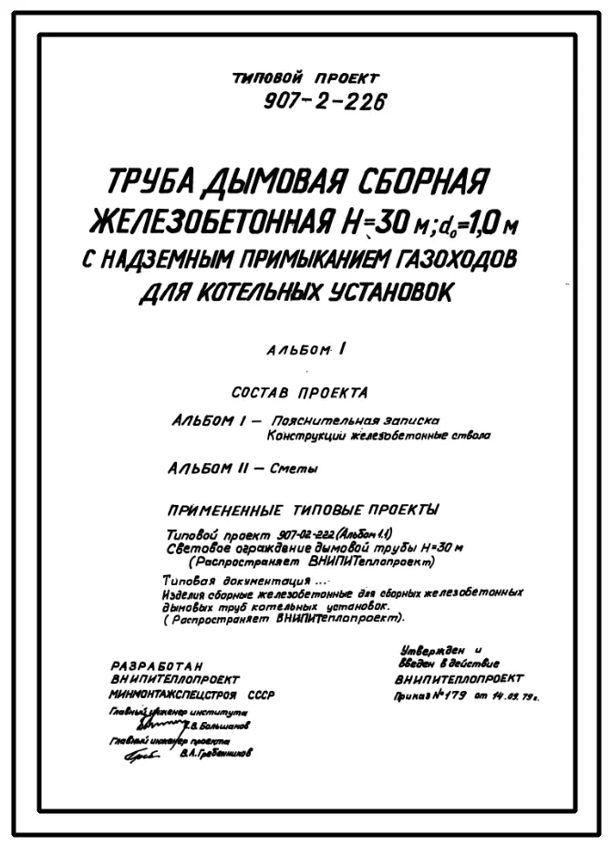 типовой проект 907-2-226 труба дымовая сборная железобетонная н=30 м, до=1,0 м с надземным примыканием газоходов для котельных установок (для 1-3 ветрового района).
