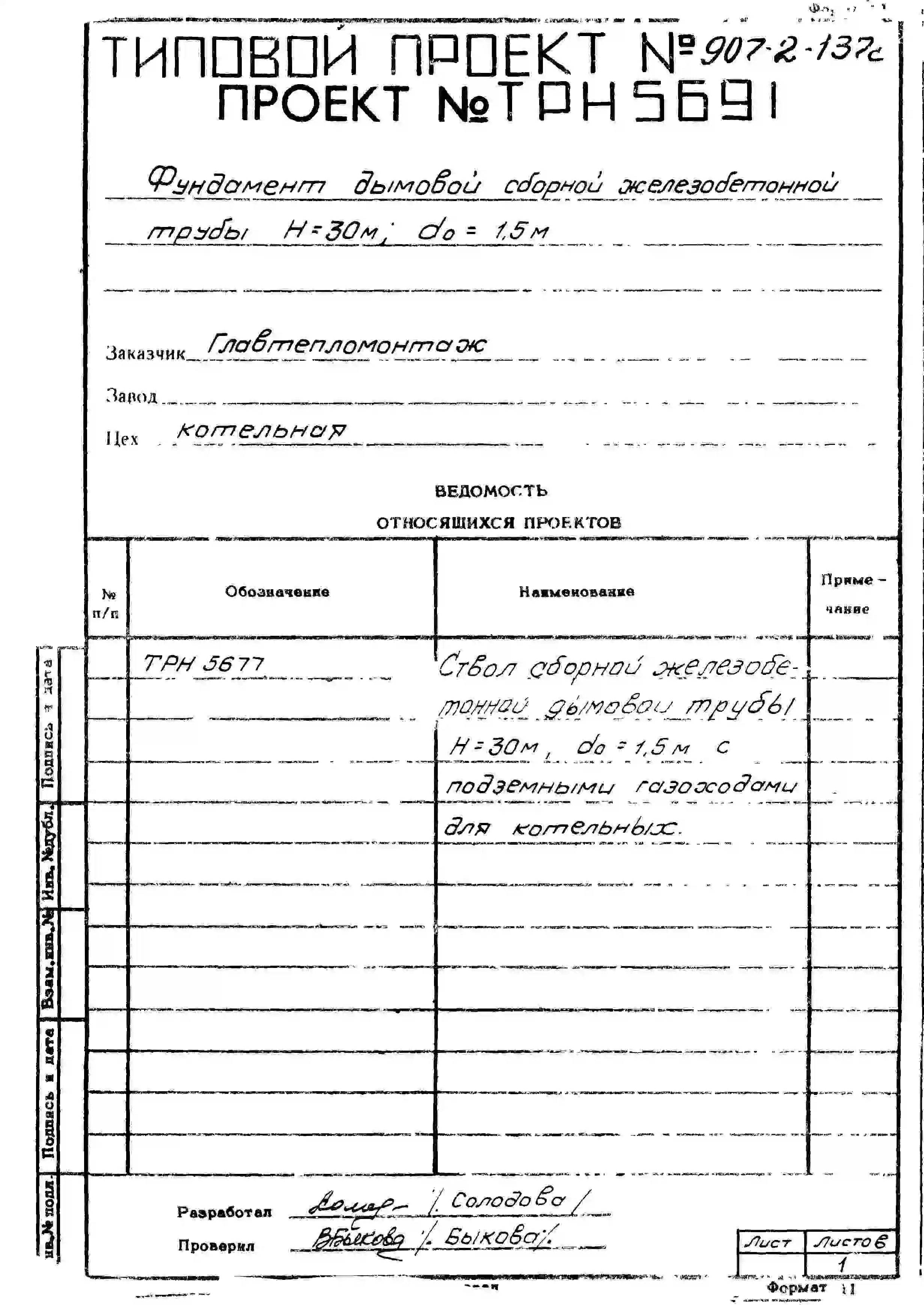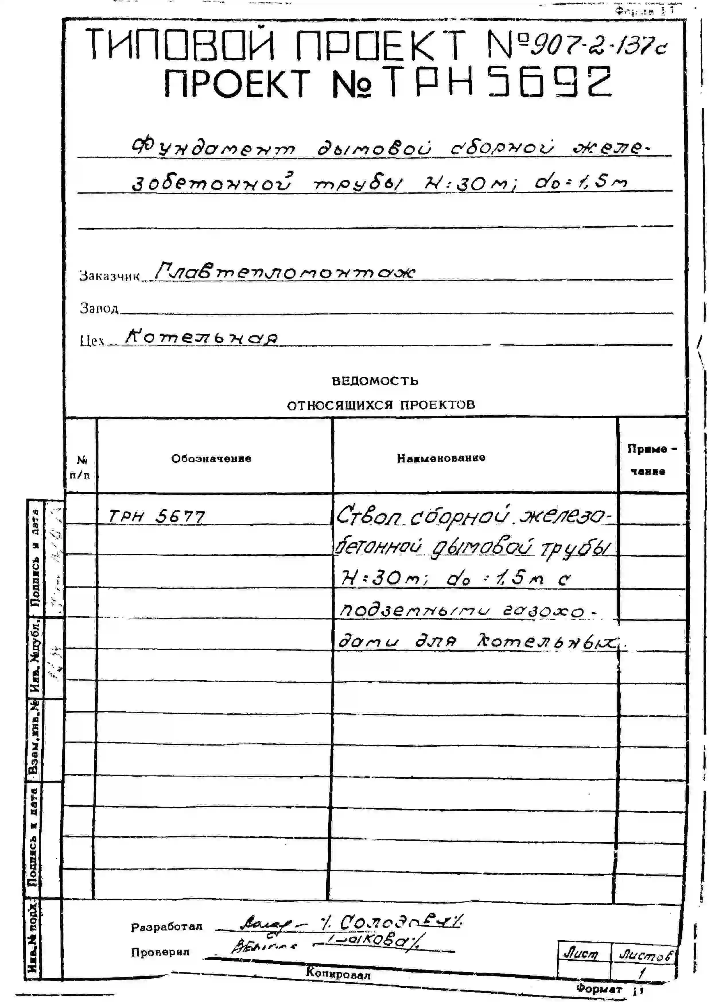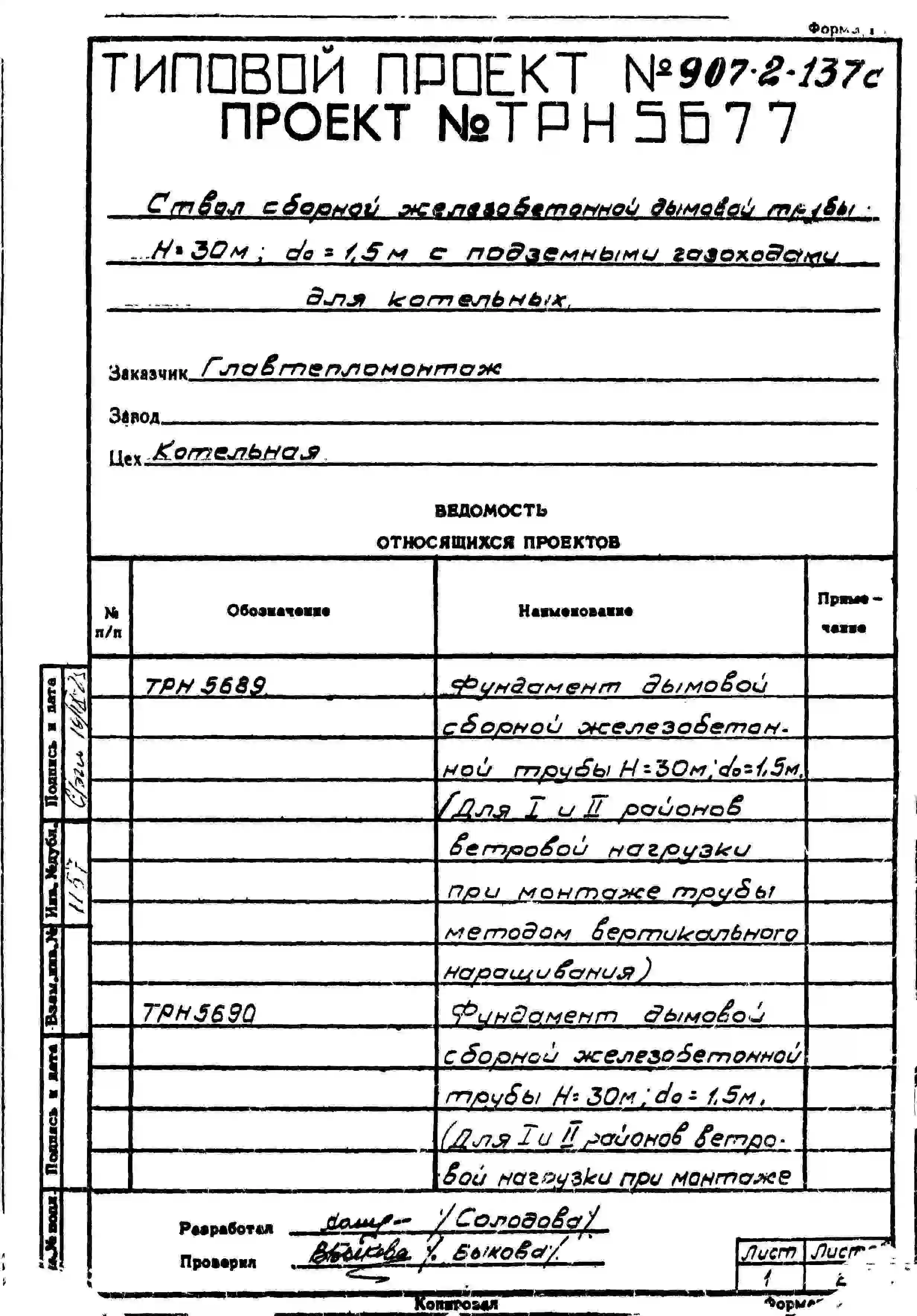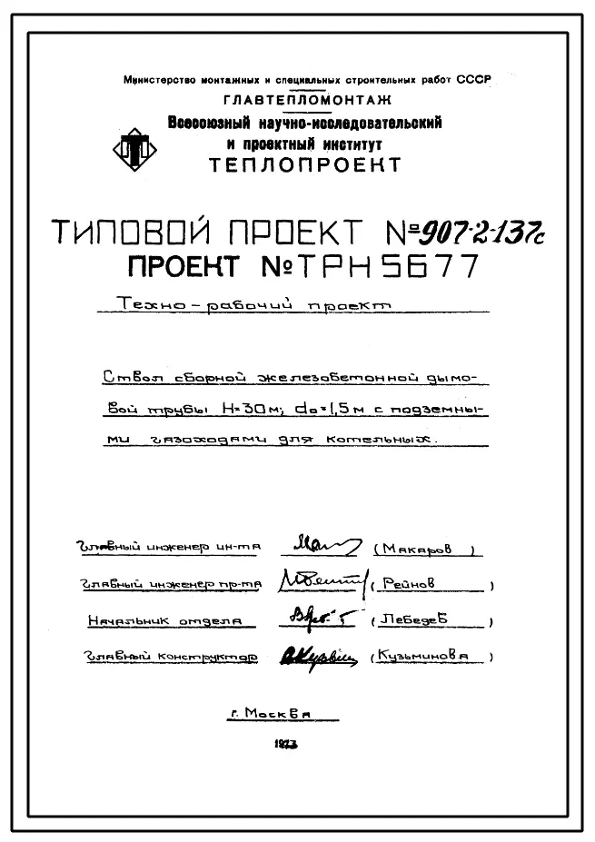 типовой проект 907-2-137с труба дымовая сборная железобетонная н=30 м, до=1,5 м с подземными газоходами для котельных.