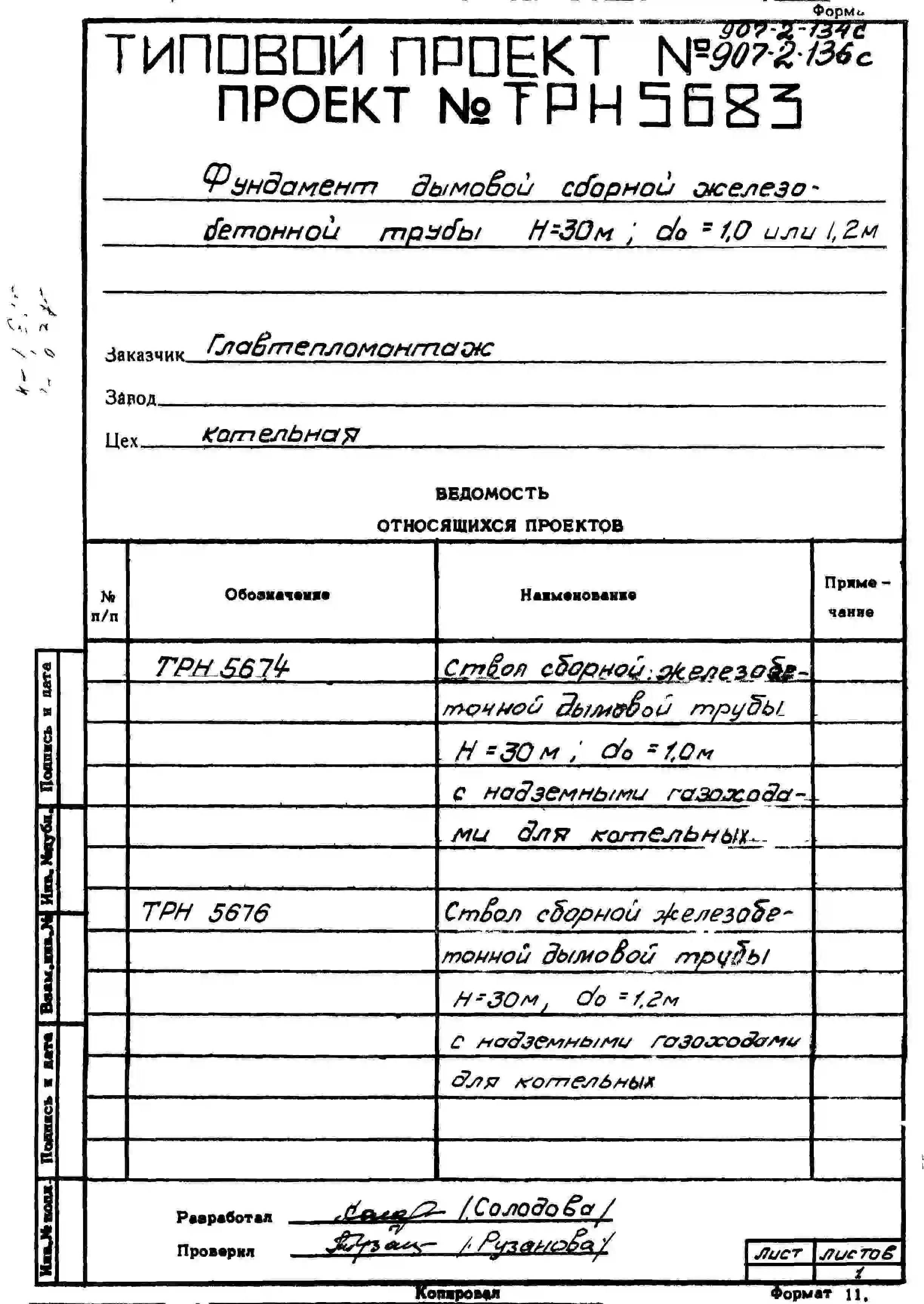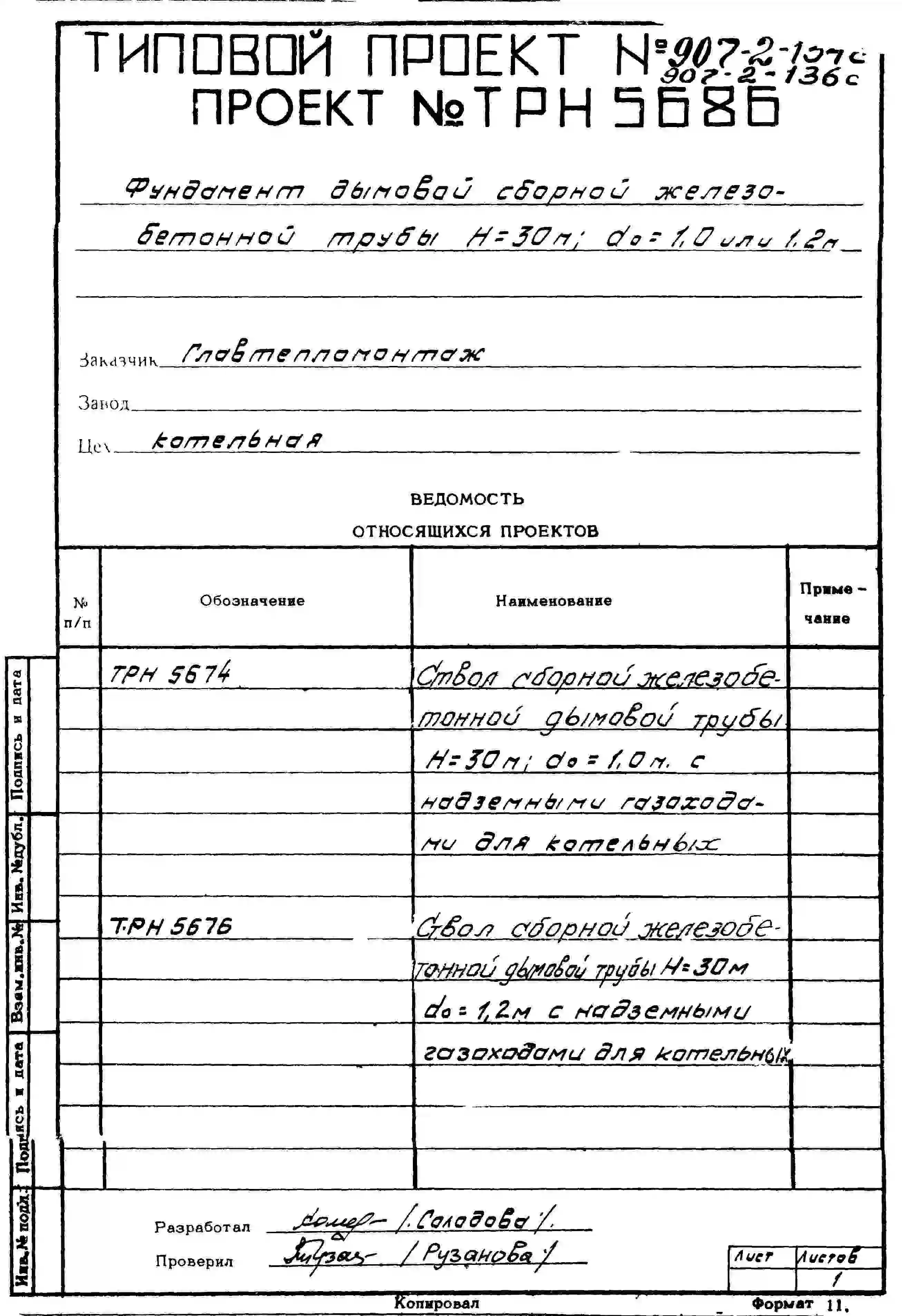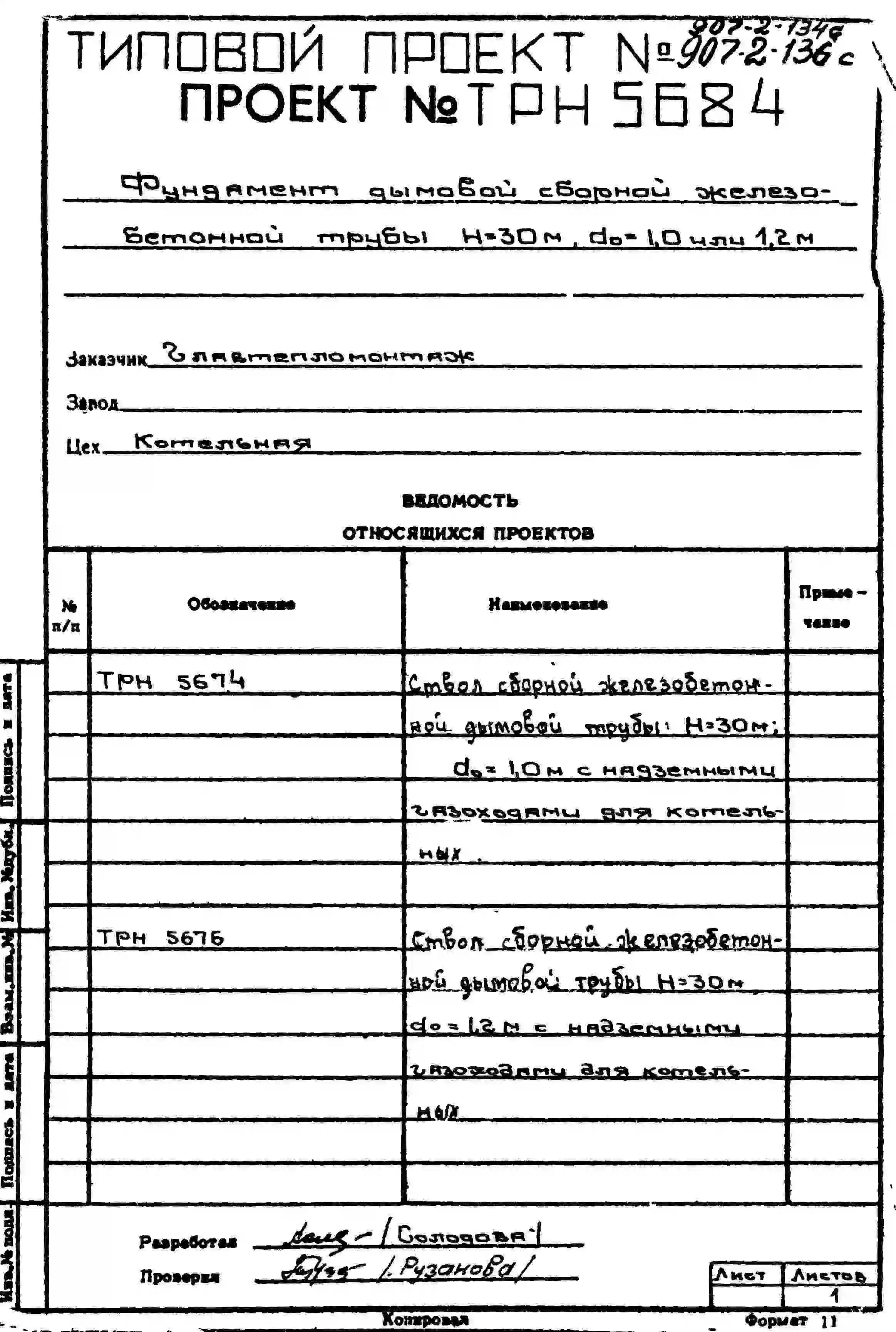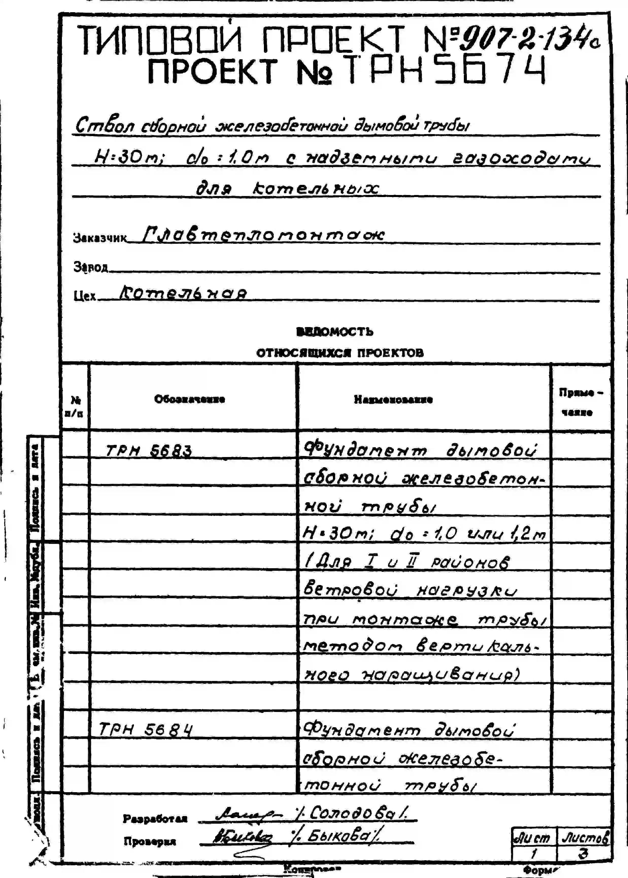 типовой проект 907-2-134с труба дымовая сборная железобетонная н=30 м, до=1,0 м с надземными газоходами для котельных.
