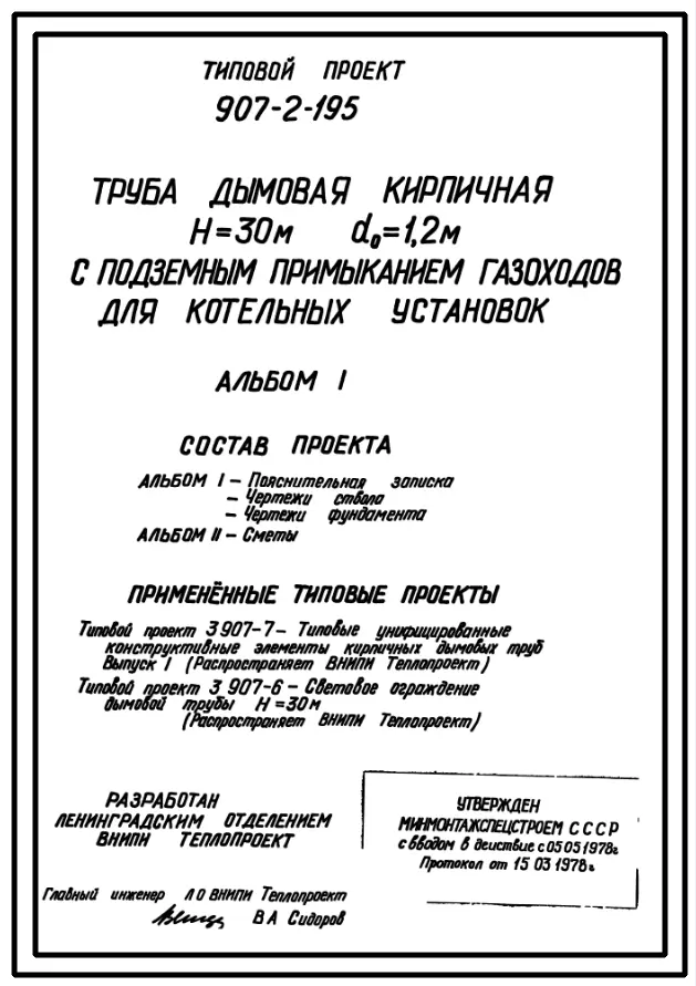 типовой проект 907-2-195 труба дымовая кирпичная н=30 м, д0=1,2 м с подземным примыканием газоходов для котельных установок. для строительства в 1-4 климатических районах кроме подрайонов 1а и 1б.