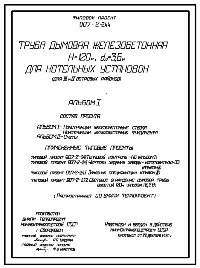 типовой проект 907-2-244 труба дымовая железобетонная н=120 м, д0=3,6 м для котельных установок (для 3 и 4 ветровых районов).