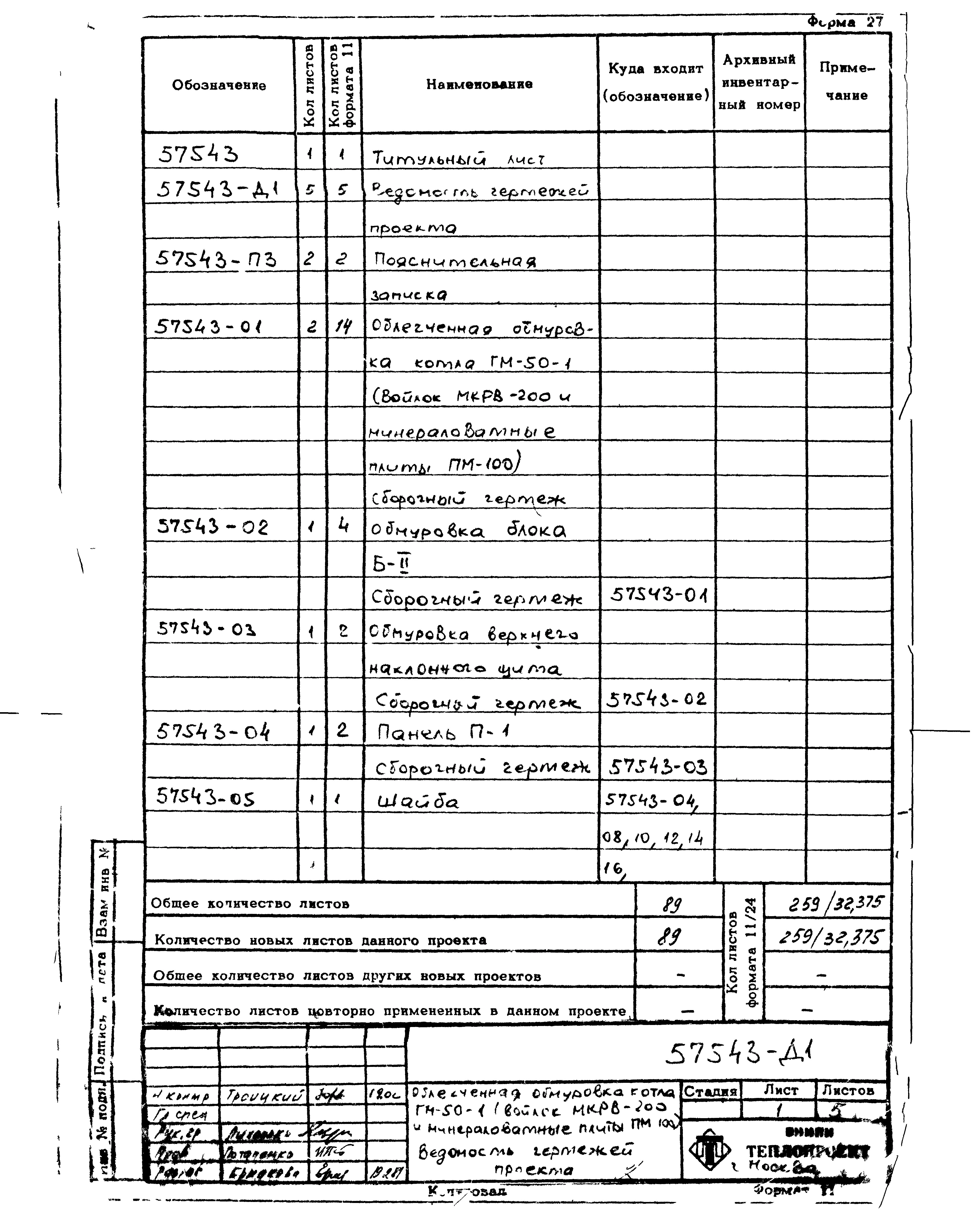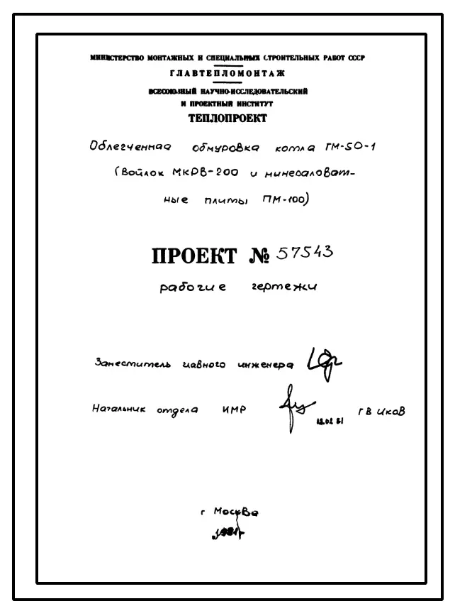 Проект 57543 Облегченная обмуровка котла ГМ-50-1 (войлок МКРВ-200 и минераловатные плиты ПМ-100)