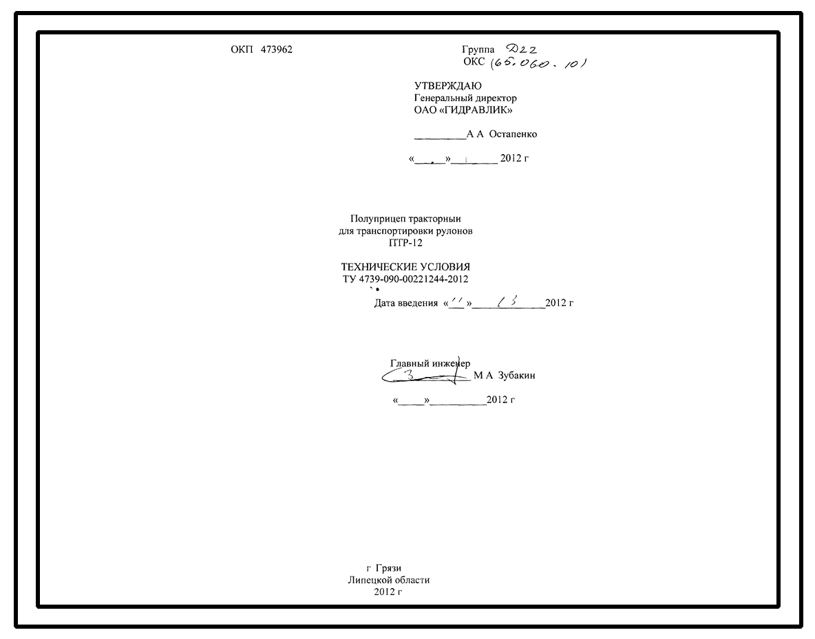 Шифр ТУ-4739-090-00221244-2012 Полуприцеп тракторный для транспортировки рулонов ПТР-12