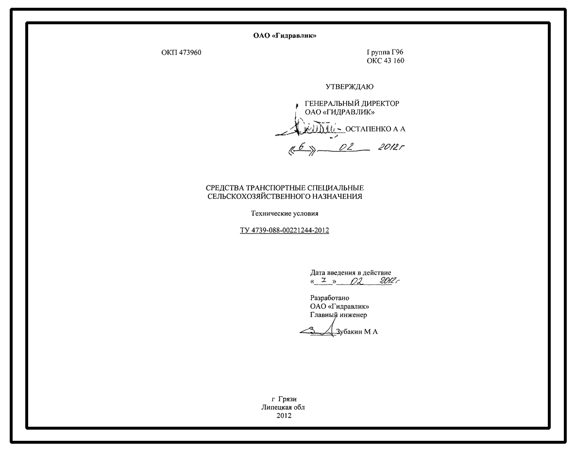 Шифр ТУ4739-088-00221244-2012 Средства транспортные специальные сельскохозяйственного назначения