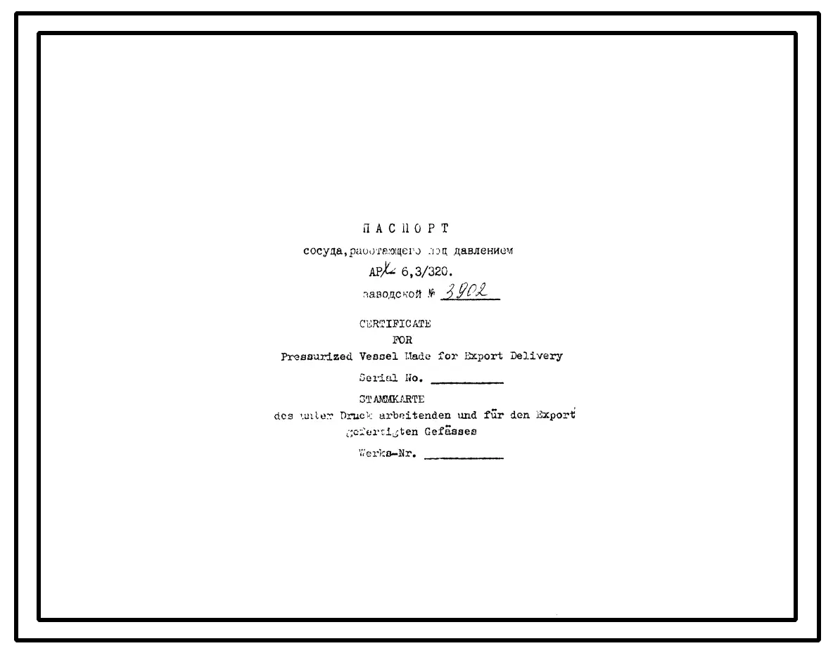 Шифр АР-6,3/320 № 3902 Сосуд, работающий под давлением