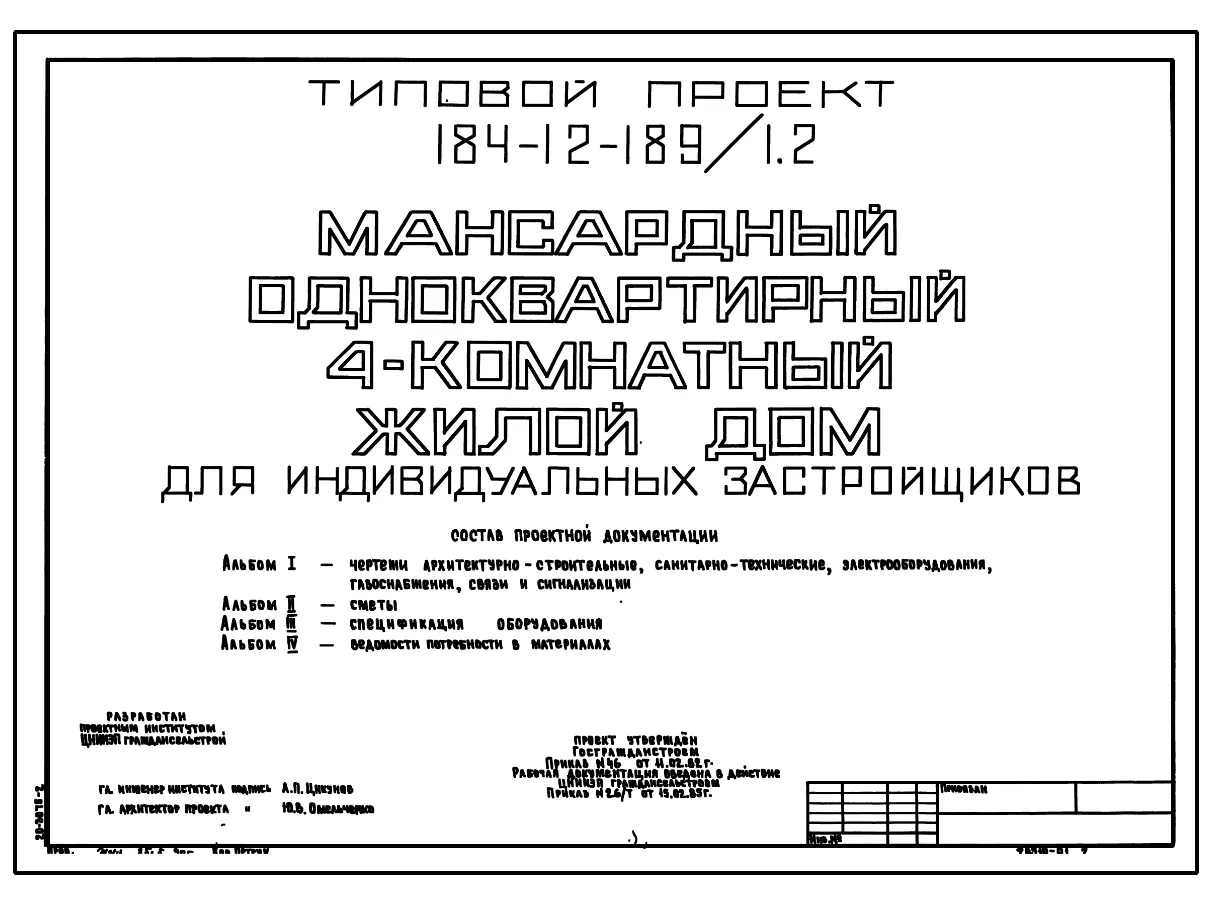 Типовой проект 184-12-189/1.2 Мансардный одноквартирный 4-комнатный жилой дом для индивидуальных застройщиков