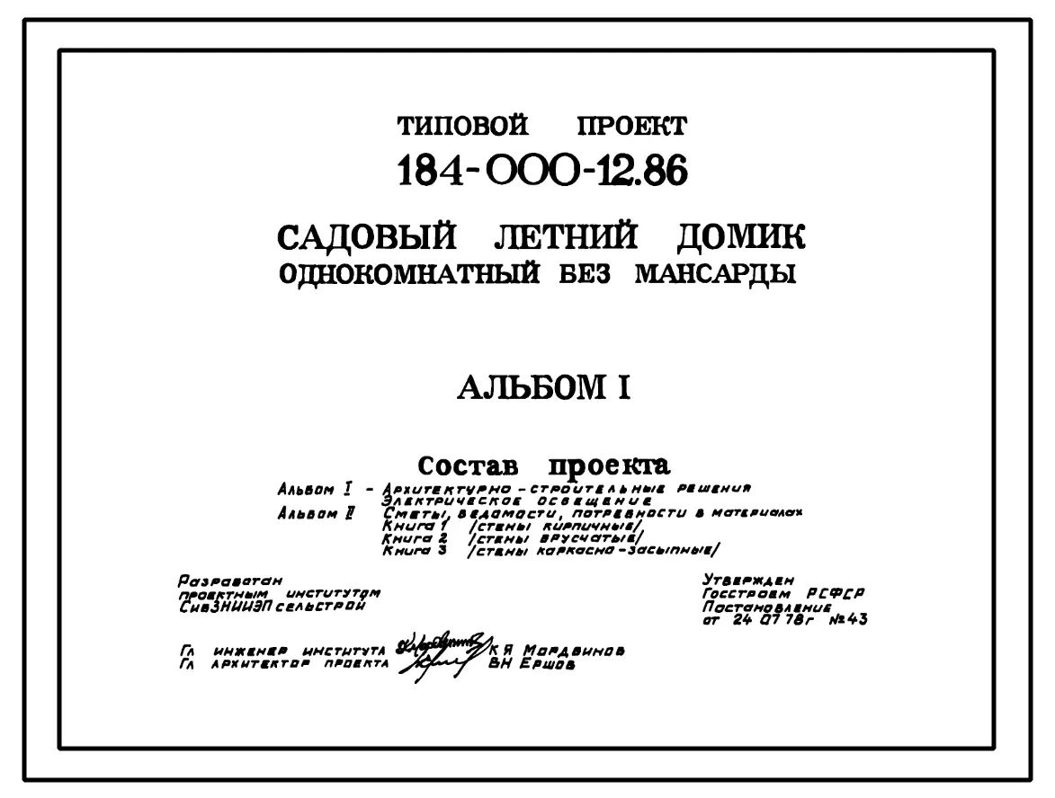 Типовой проект 184-000-12.86 Однокомнатный летний садовый домик. Площадь, м2: общая 14,8, веранды 9,5