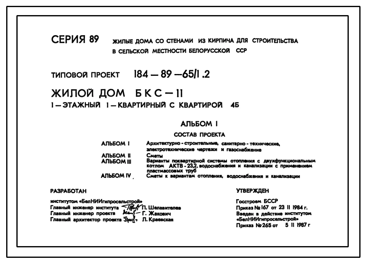 Типовой проект 184-89-65/1.2 Жилой дом (БКС-11) 1-этажный 1-квартирный с квартирой 4Б