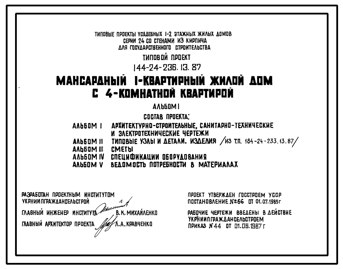 Типовой проект 144-24-236.13.87 Мансардный 1-квартирный жилой дом с 4-комнатной квартирой (для строительства в северо-центральных районах Украинской ССР)