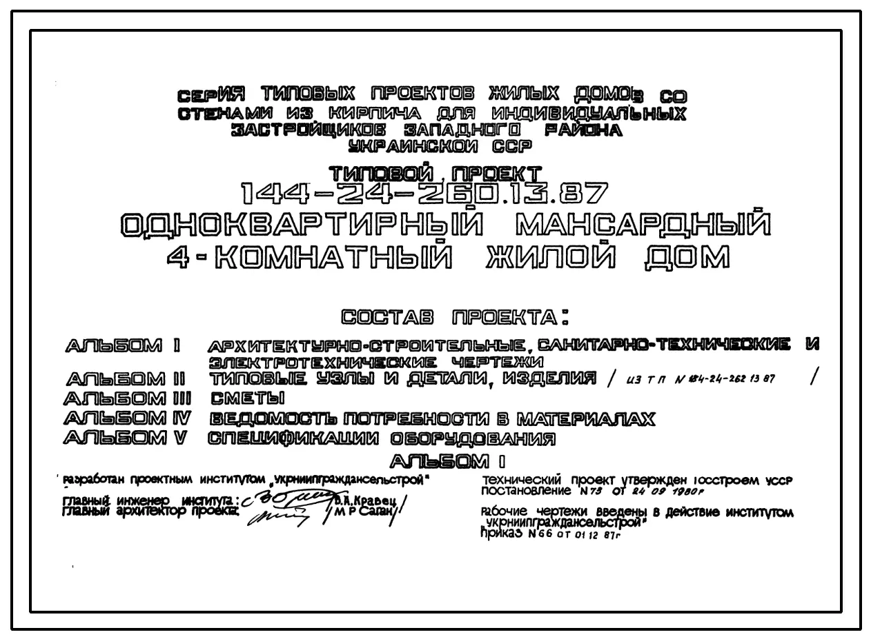 Типовой проект 144-24-260.13.87 Одноквартирный мансардный 4-комнатный жилой дом (для индивидуальных застройщиков западных районов УССР)