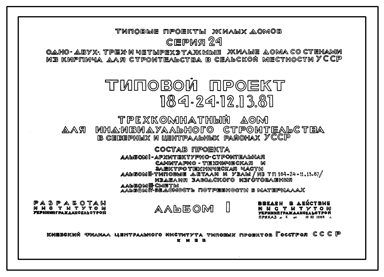 Типовой проект 184-24-12.13.87 Трехкомнатный дом (для индивидуального строительства в северных и центральных районах УССР)