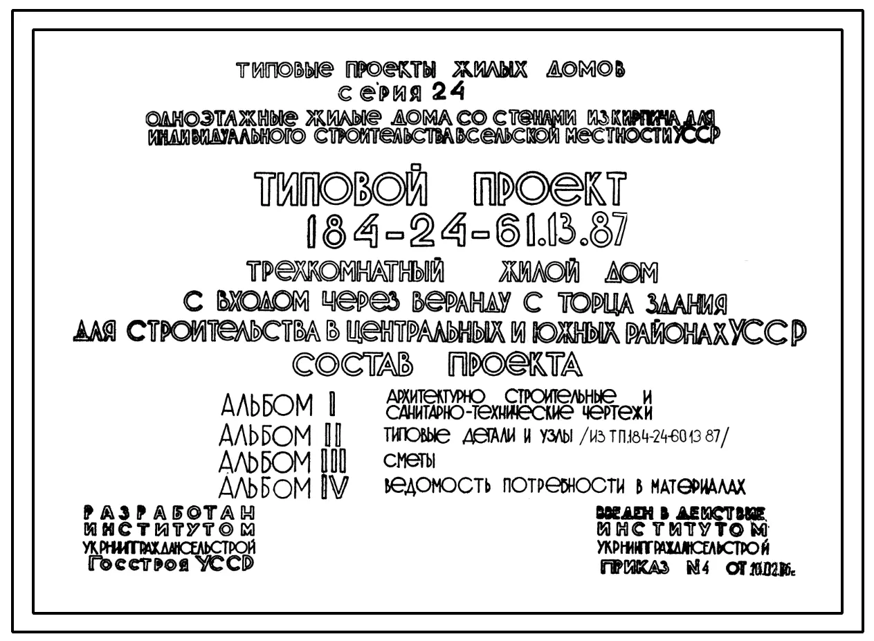 Типовой проект 184-24-61.13.87 Трехкомнатный жилой дом (с входом через веранду с торца здания для строительства в центральных и южных районах УССР)