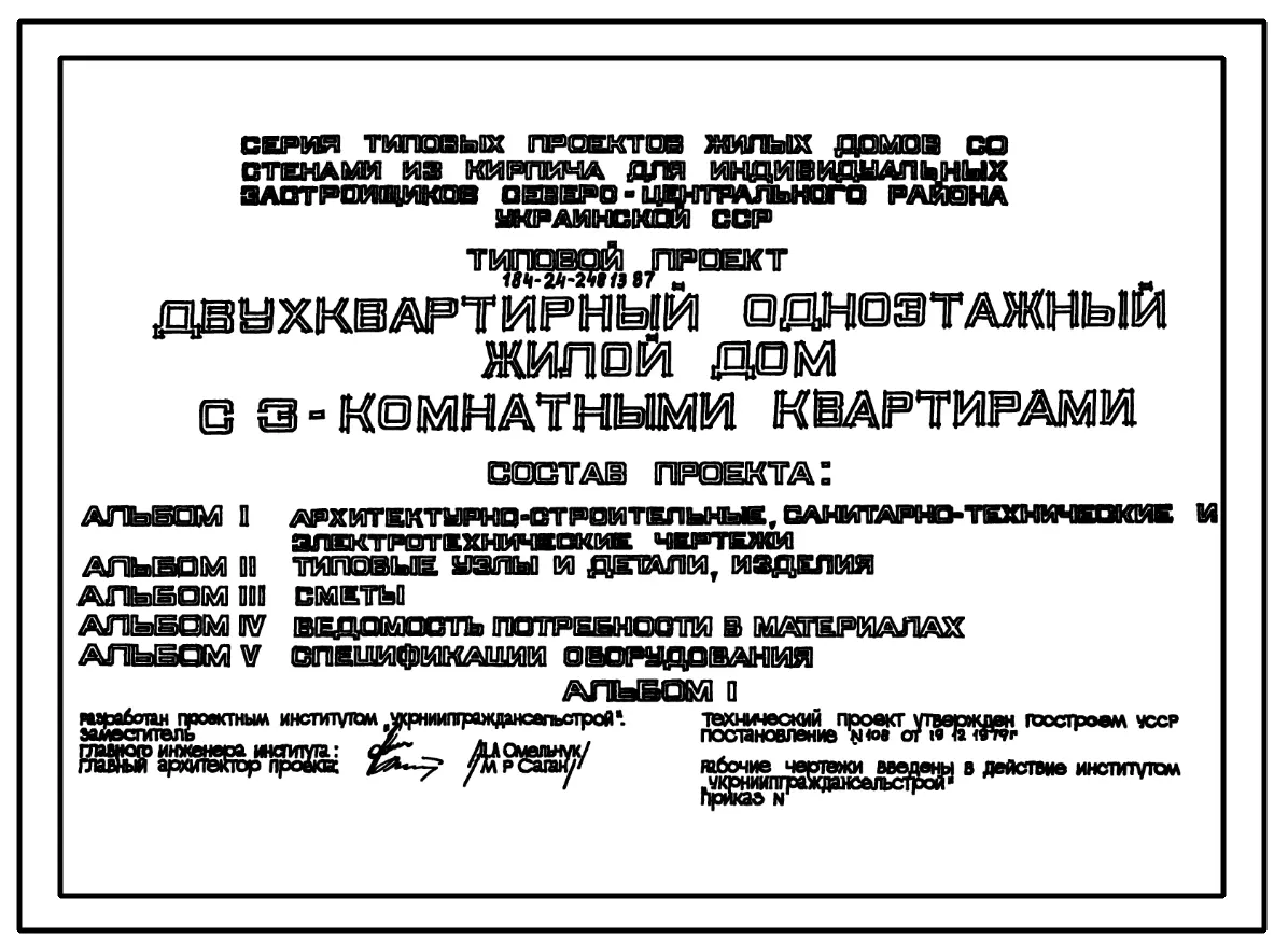 Типовой проект 184-24-248.13.87 Двухквартирный одноэтажный жилой дом с 3-комнатными квартирами (для индивидуальных застройщиков северо-центральных районов УССР)