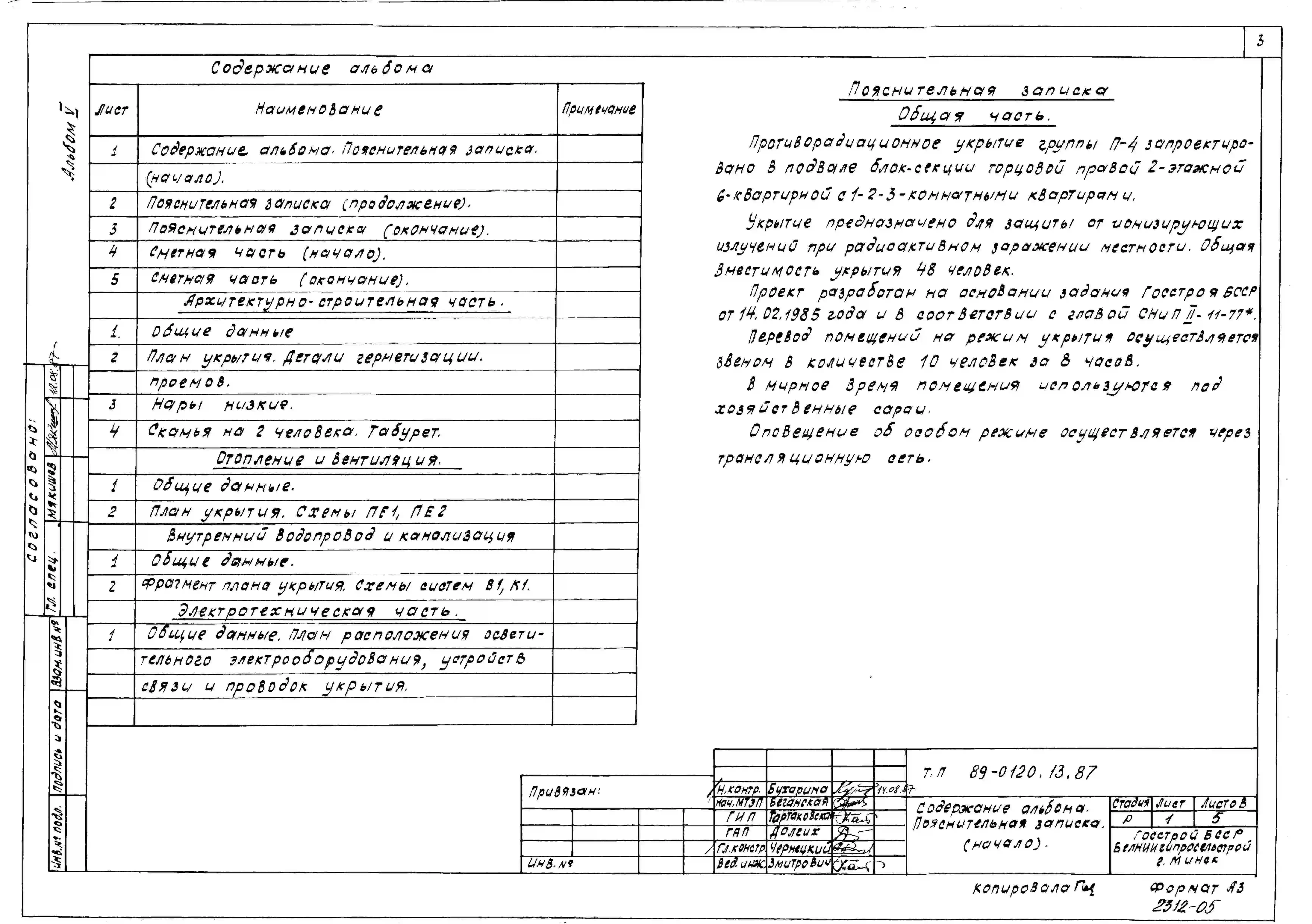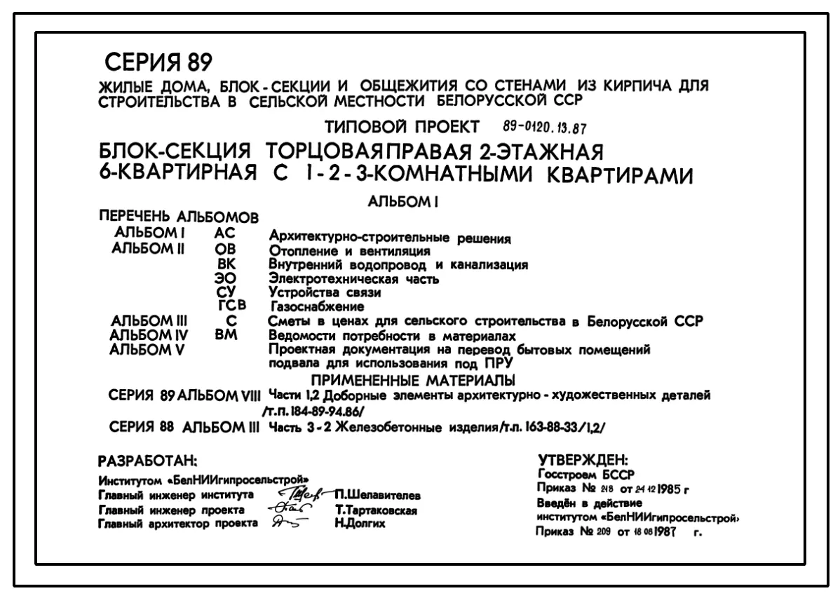 Типовой проект 89-0120.13.87 Блок-секция торцевая правая 2-этажная 6-квратирная с 1-2-3-комнатными квартирами. Для строительства в Белорусской ССР.