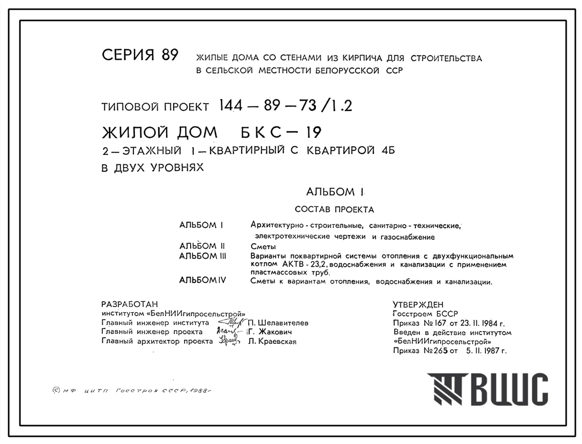 Типовой проект 144-89-73/1 Двухэтажный жилой дом с четырехкомнатной квартирой 4Б в двух уровнях (шифр БКС-19). Для строительства во 2В климатическом подрайоне Белорусской ССР