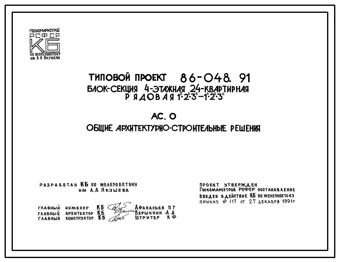 Типовой проект 86-048.91 Блок-секция 4-этажная 24-квартирная рядовая 1Б.2Б.3Б - 1Б.2Б.3Б
