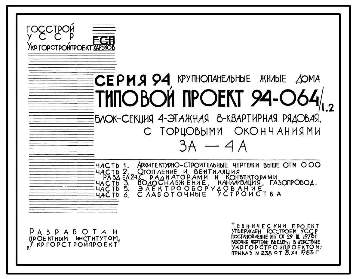 Типовой проект 94-064/1.2 Блок-секция 4-этажная 8-квартирная рядовая, с торцовыми окончаниями, 3А-4А