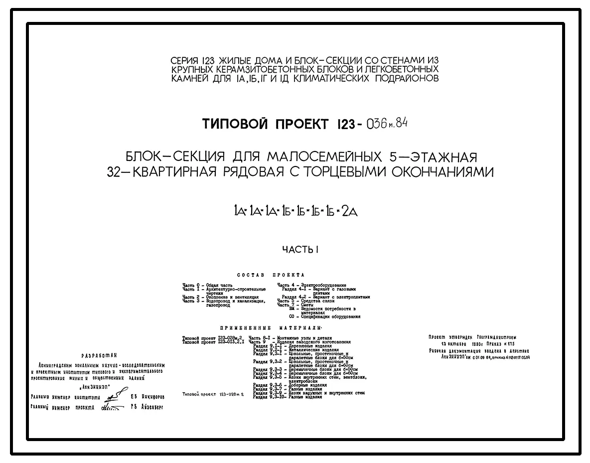 Типовой проект 123-036м.84 Блок-секция для малосемейных 5-этажная 32-квартирная рядовая с торцевыми окончаниями 1А-1А-1А-1Б-1Б-1Б-1Б-2А