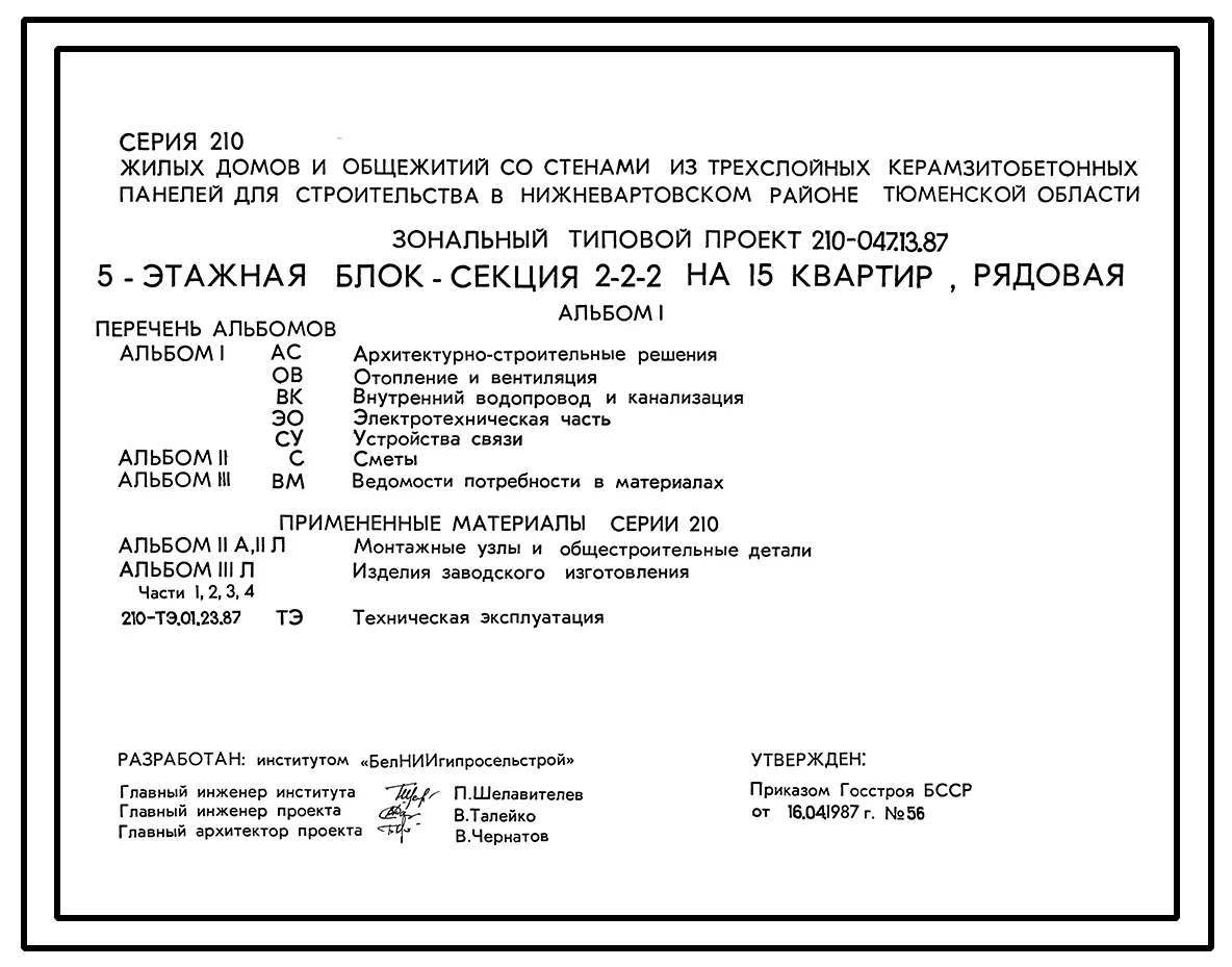 Типовой проект 210-047.13.87 5-этажная блок-секция 1-2-3 на 15 квартир рядовая (для строительства в Нижневартовском районе Тюменской области)