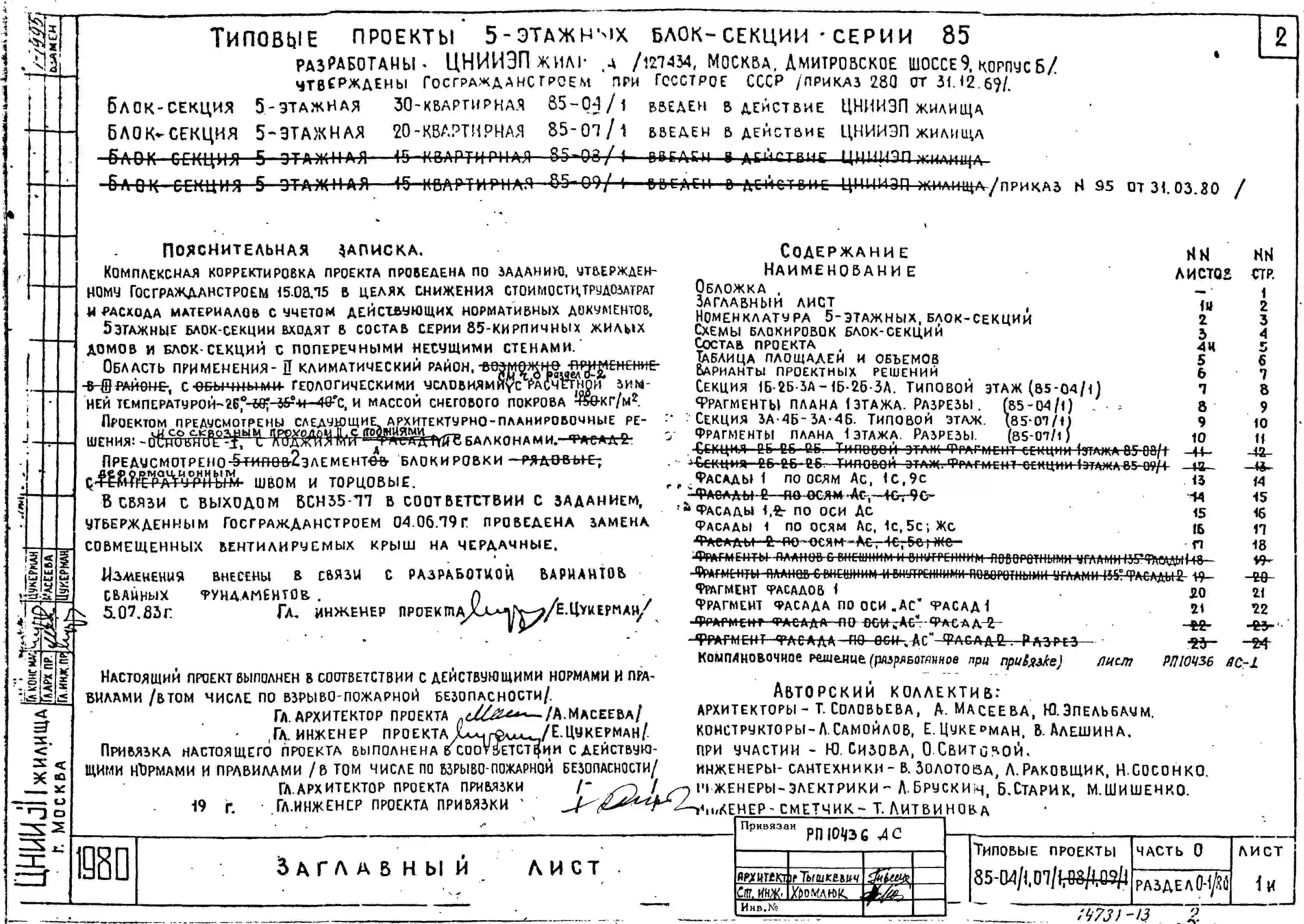 Типовой проект 85-07/1 Блок-секция 5-этажная 20-квартирная 3А.4Б - 3А.4Б
