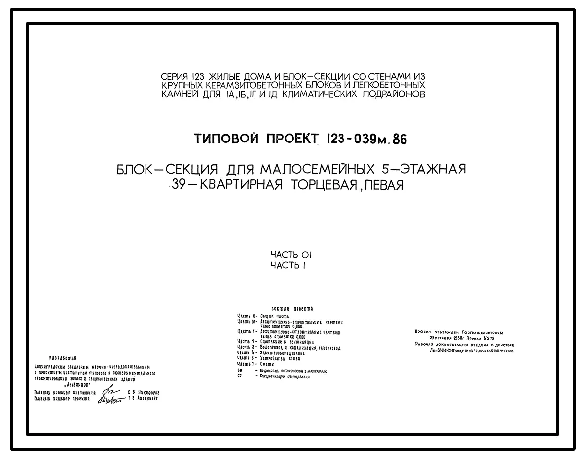 Типовой проект 123-039м.86 Блок-секция для малосемейных 5-этажная 39-квартирная торцевая левая 1А.1А.1А.1Б.1Б.2А.2А.2А
