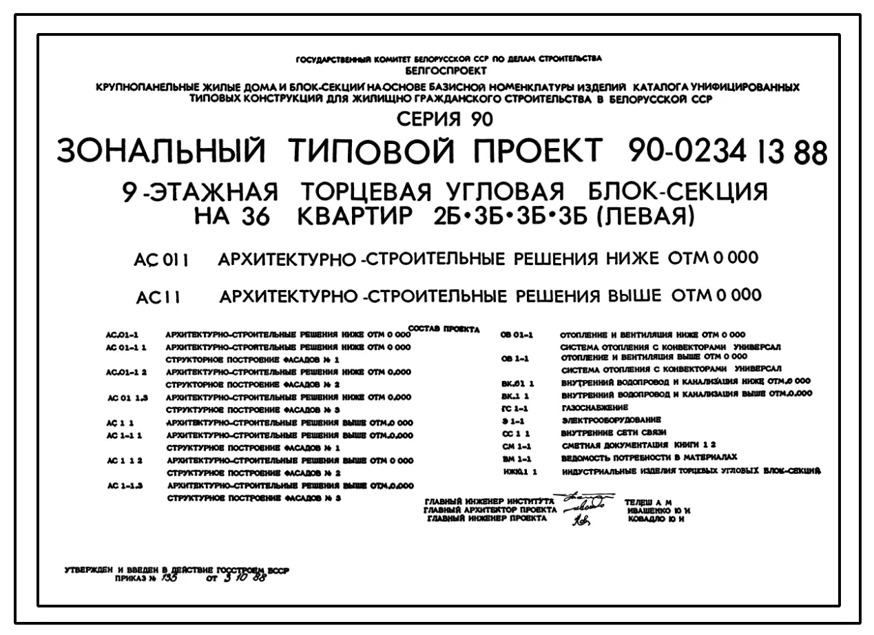 Типовой проект 90-0234.13.88 9-этажная торцевая-угловая блок-секция на 36 квартир 2-3-3-3 (левая) (для строительства в Белорусской ССР)